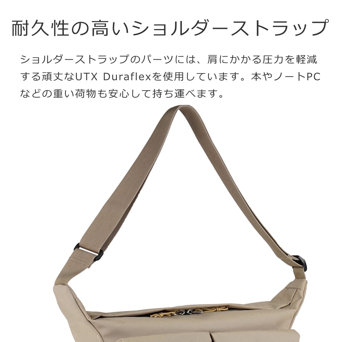 ショルダーストラップのパーツには、肩にかかる圧力を軽減する頑丈なUTX Duraflexを使用。本やノートPCなどの重い荷物も安心して持ち運べます。