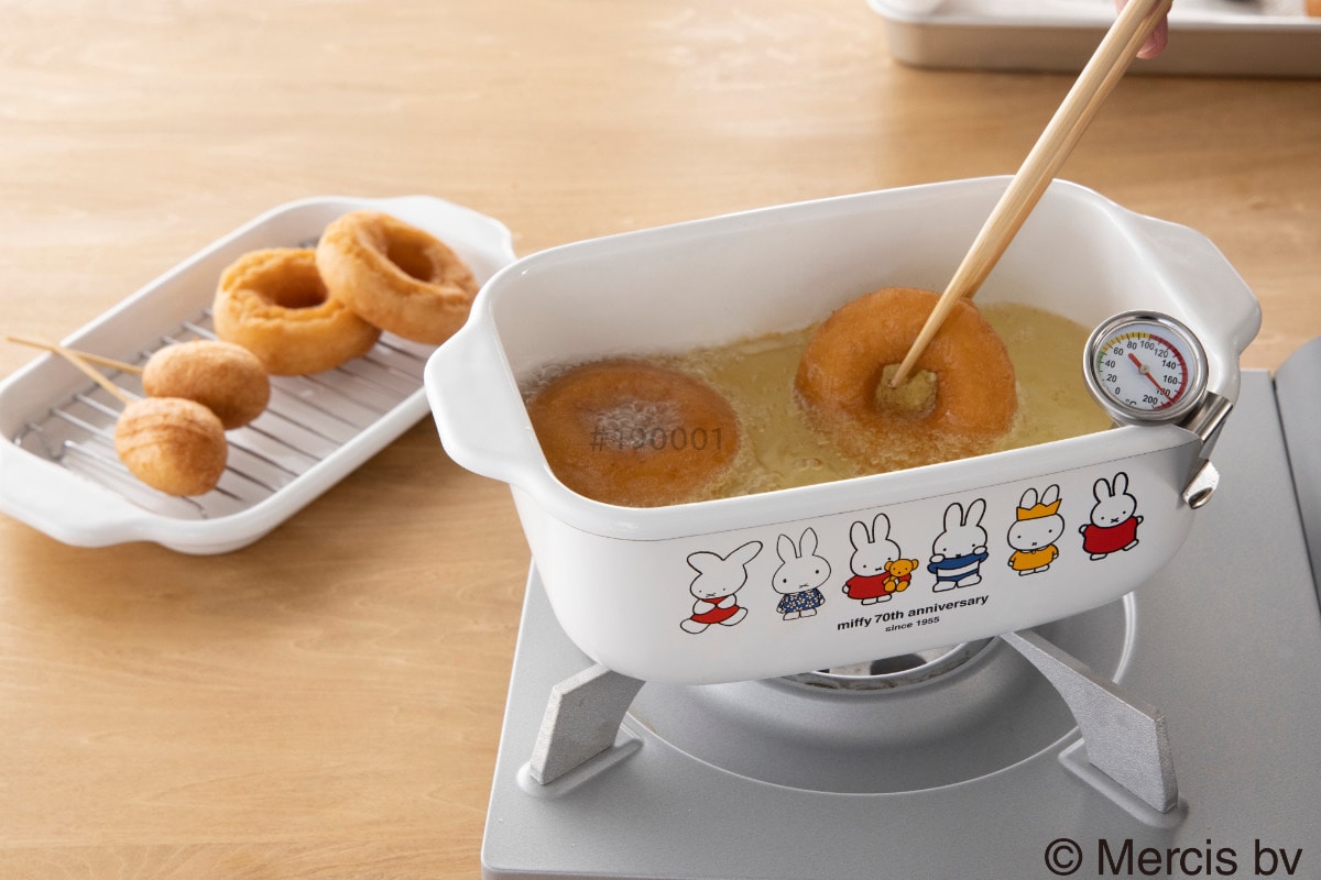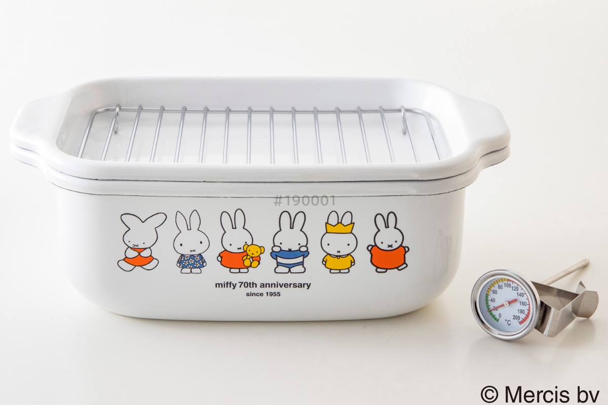かわいいミッフィーが並ぶコンパクトでスリムな天ぷら鍋です。角型なので小さめなのに長い食材も調理しやすく、少ない油で揚げ物に十分な深さを確保できます。どこか懐かしい雰囲気のデザインのお鍋がキッチンを彩ります。