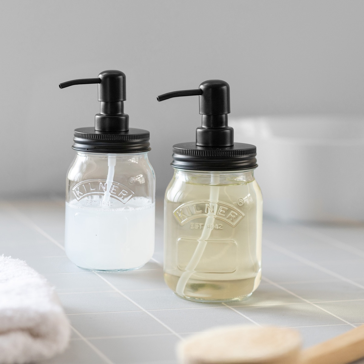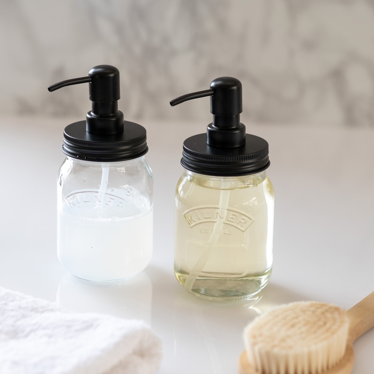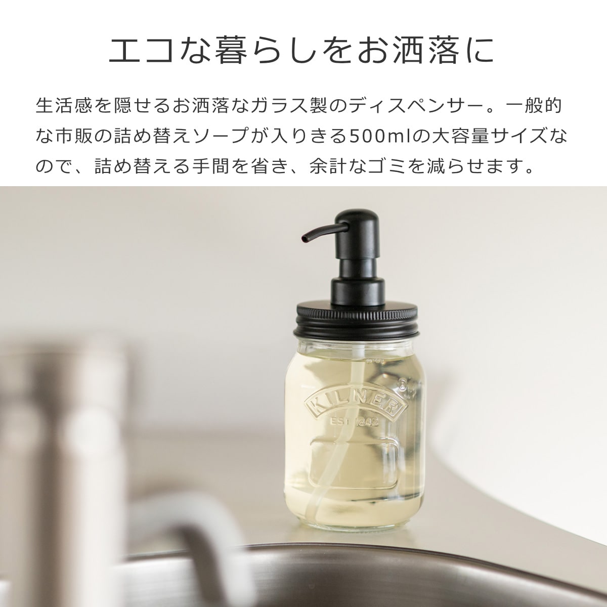 ハンドソープや台所用洗剤を詰め替えることで、生活感を隠せるお洒落なガラス製のディスペンサーです。500mlと大容量で、一般的な市販の詰め替えソープ(350~400ml)が入りきります。頻繁に詰め替える手間を省き、余計なゴミを減らすことができます