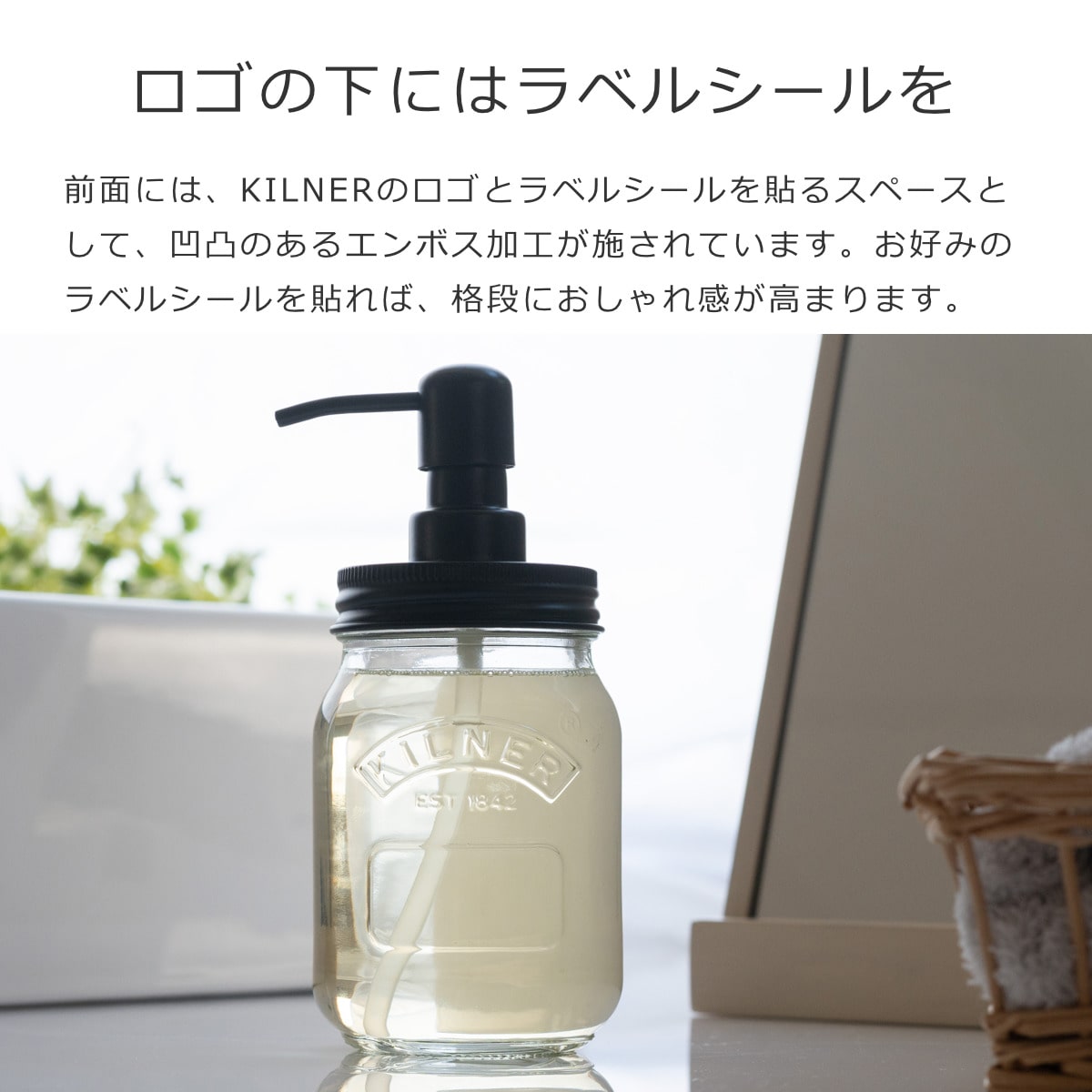 前面には、KILNERのロゴとラベルシールを貼るスペースとして、凹凸のあるエンボス加工が施されています。お好みのラベルシールを貼れば、格段におしゃれ感が高まります。