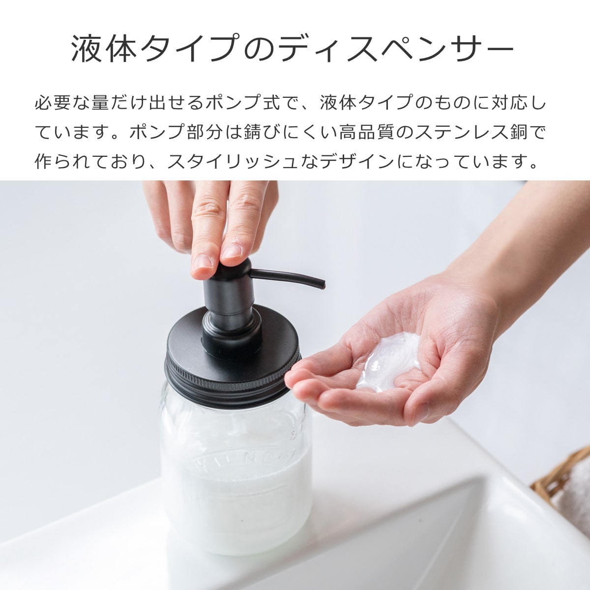 必要な量だけ出せるポンプ式で、液体タイプのものに対応しています。ポンプ部分は錆びにくい高品質のステンレス銅で作られており、マットブラック仕上げでコーティングされることによって、スタイリッシュなデザインになっています。