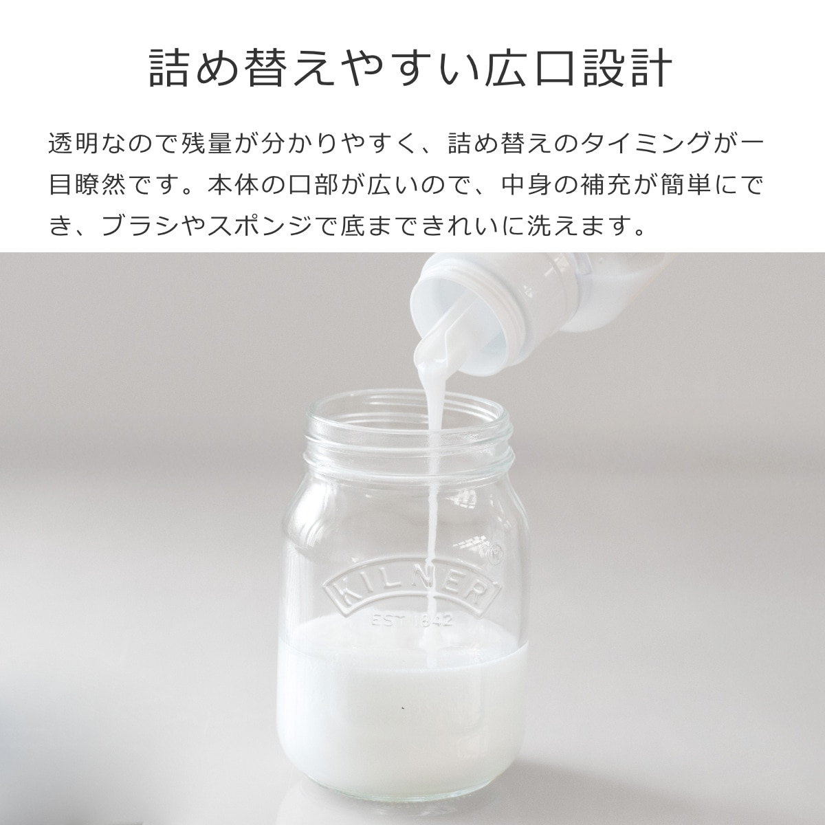 透明なので残量が分かりやすく、詰め替えのタイミングが一目瞭然です。本体の口部が広いので、中身の補充が簡単にでき、ブラシやスポンジで底まできれいに洗えます。