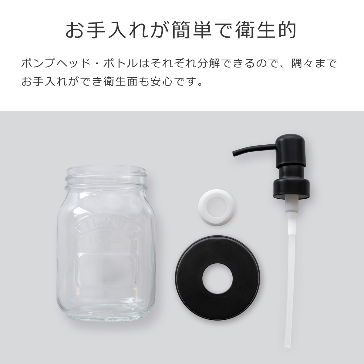 ポンプヘッド・ボトルはそれぞれ分解できるので、隅々までお手入れができ衛生面も安心です。