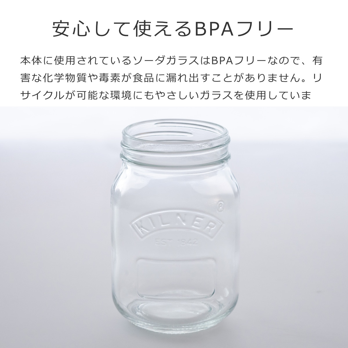 本体に使用されているソーダガラスはBPAフリーなので、有害な化学物質や毒素が食品に漏れ出すことがありません。割れてしまってもリサイクルが可能な環境にもやさしいガラスを使用しています。