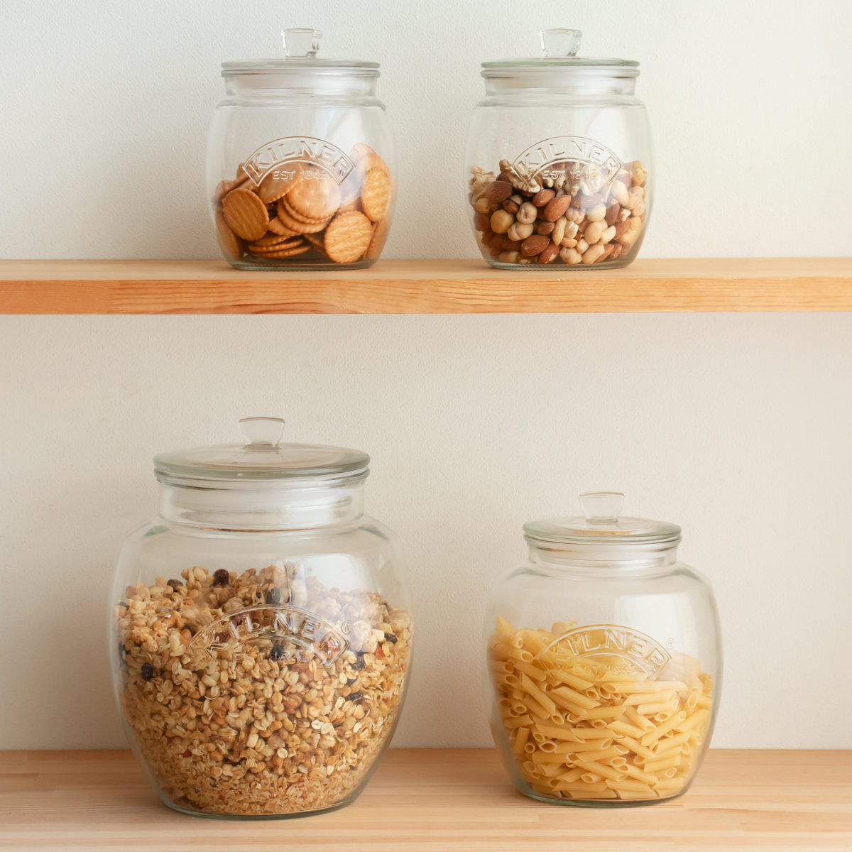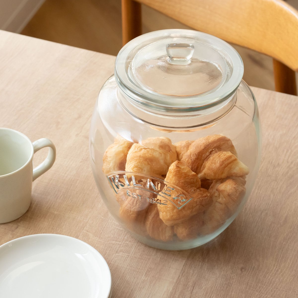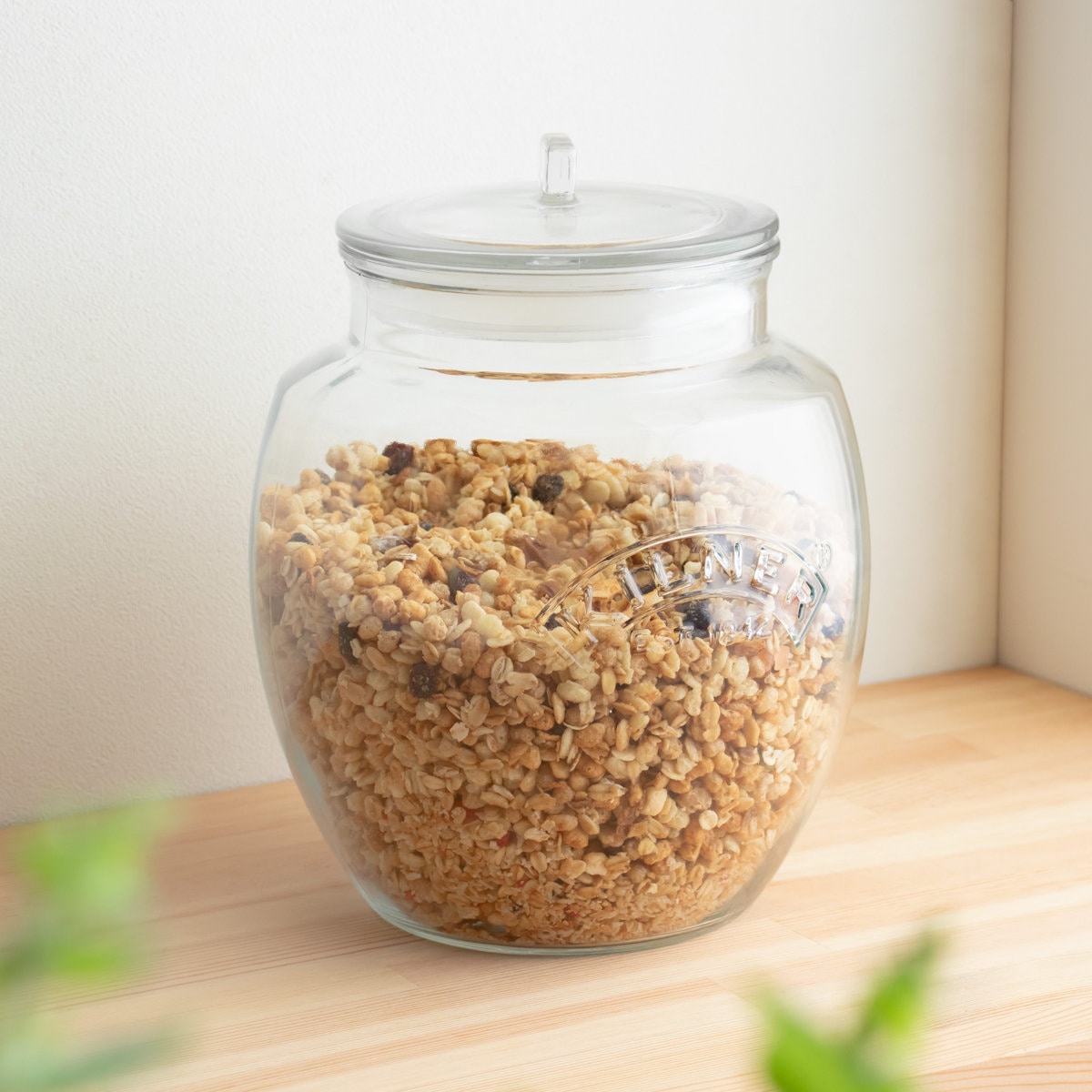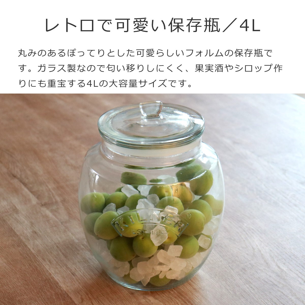丸みのあるぽってりとした可愛らしいフォルムの保存瓶です。エンボス加工で「KILNER」のロゴが施された、レトロ可愛いデザインです。ガラス製なので匂い移りしにくく、果実酒やシロップ作りにも重宝する4Lの大容量サイズです。