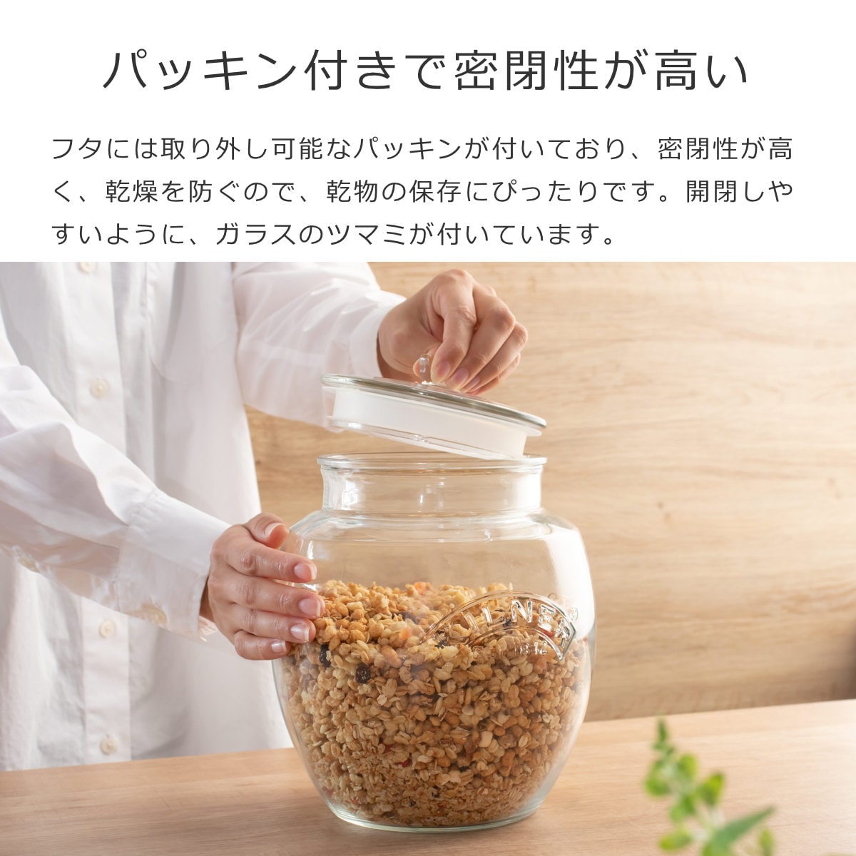 フタには取り外し可能なパッキンが付いており、密閉性が高く、乾燥を防ぐので、ナッツや乾物類などの保存にぴったりです。開閉しやすいように、ガラスのツマミが付いています。