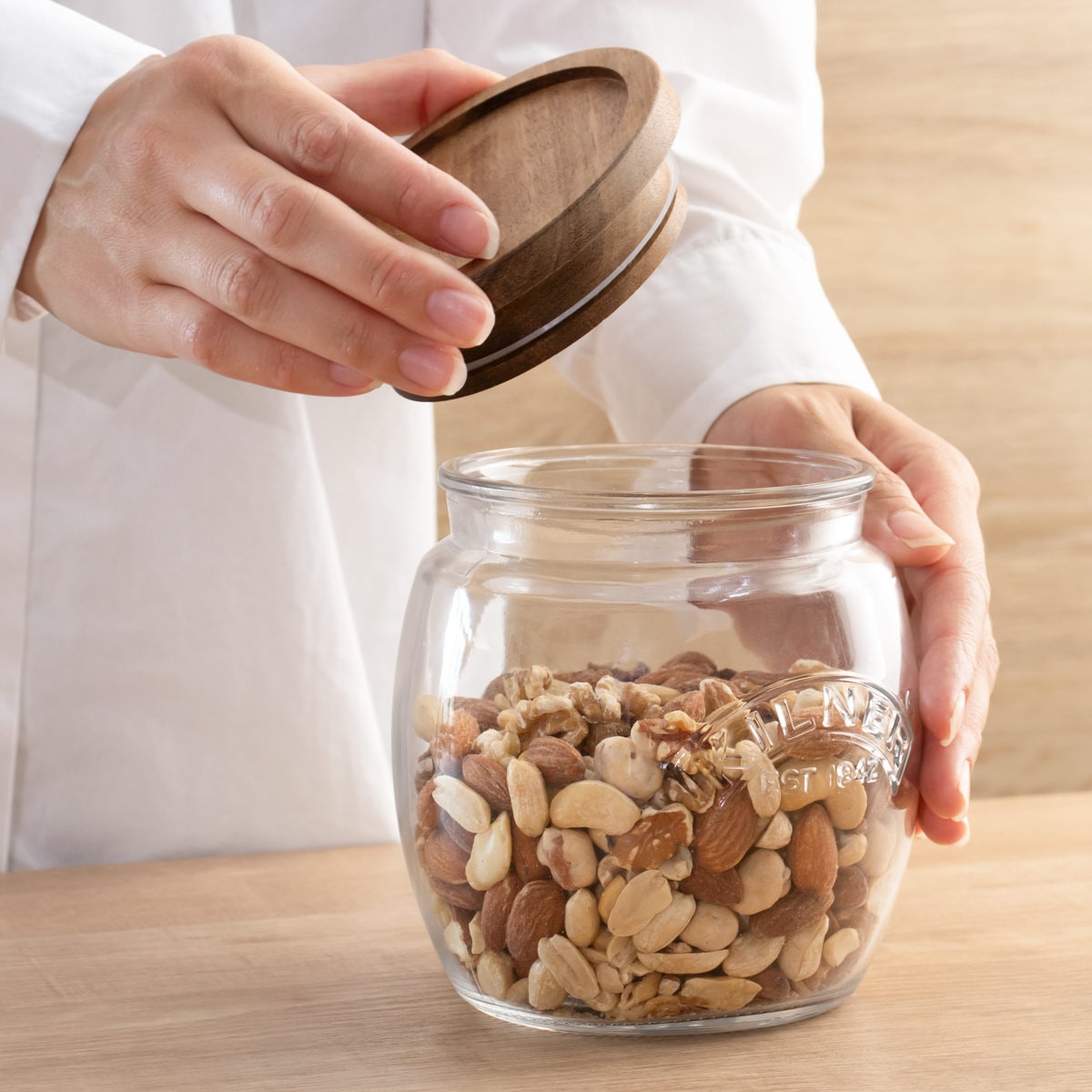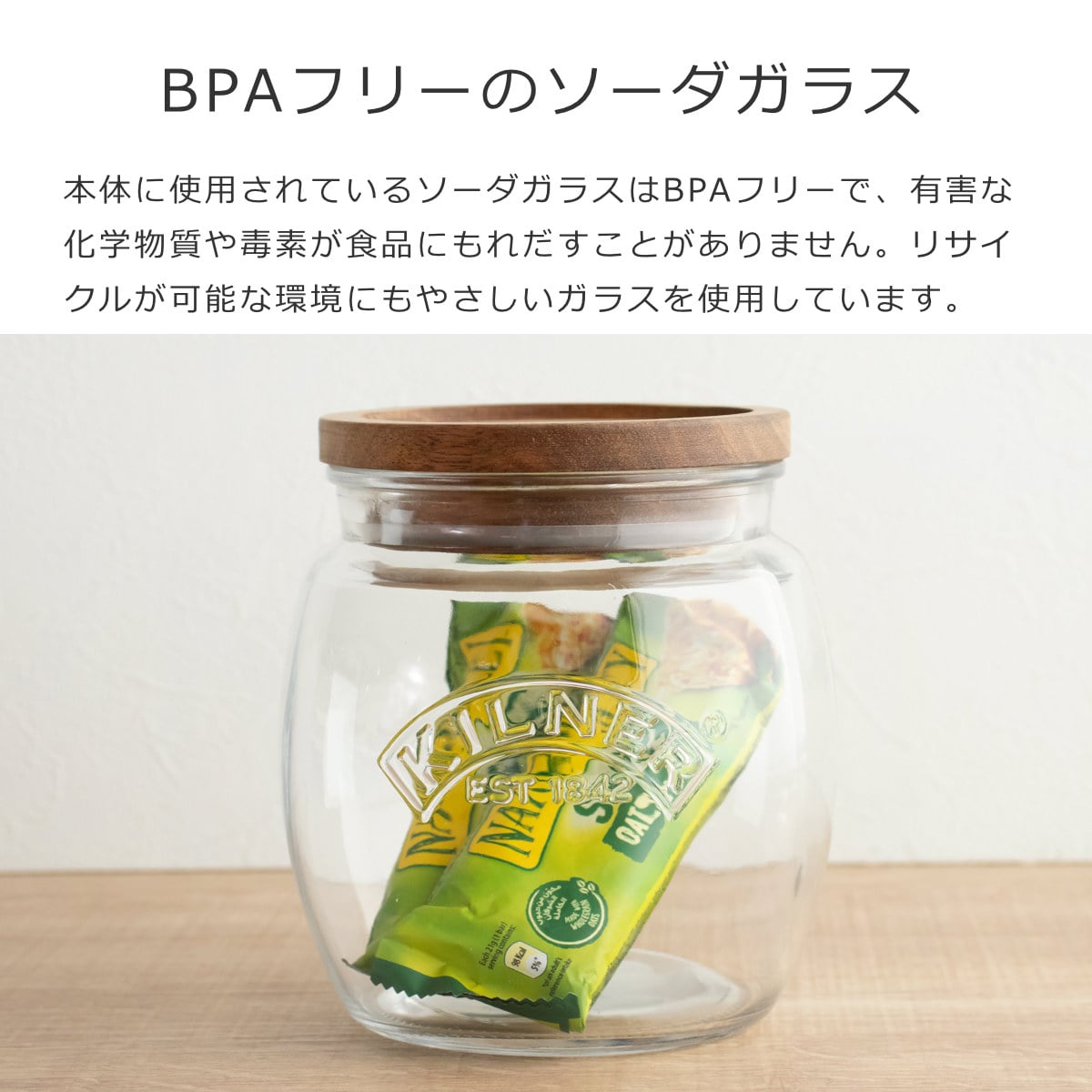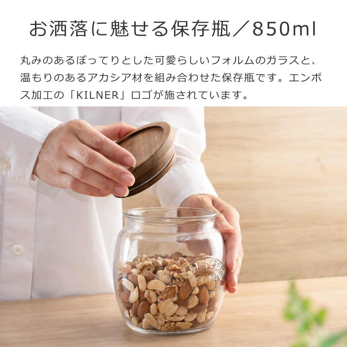 丸みのあるぽってりとした可愛らしいフォルムのガラスと、温もりのあるアカシア材を組み合わせた保存瓶です。エンボス加工で「KILNER」のロゴが施されており、何を入れてもお洒落に魅せてくれます。