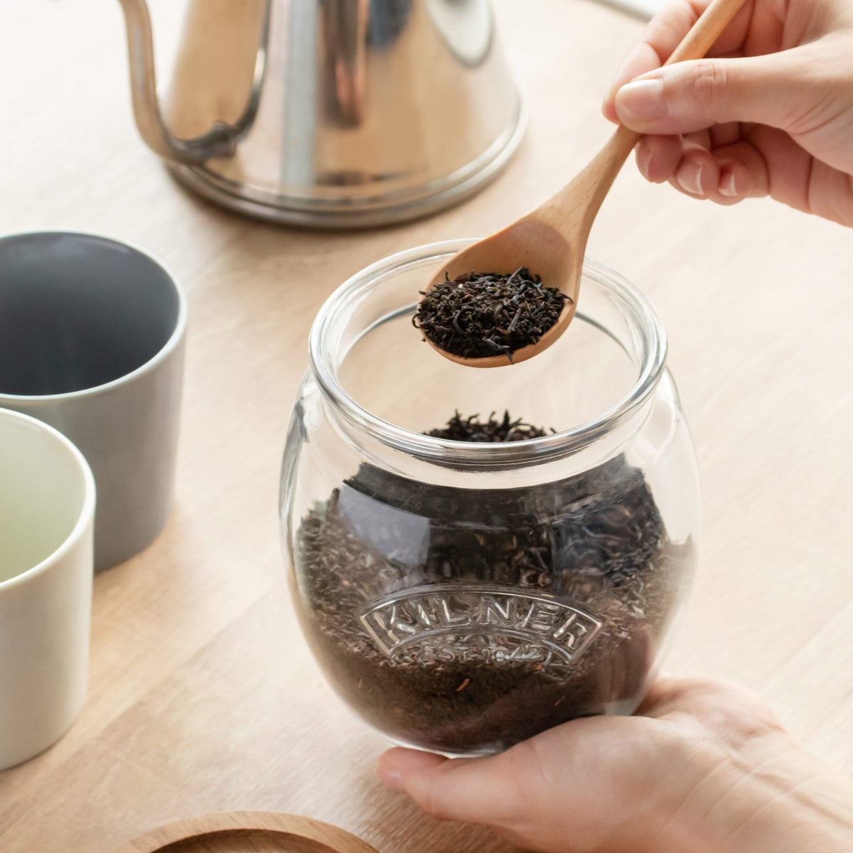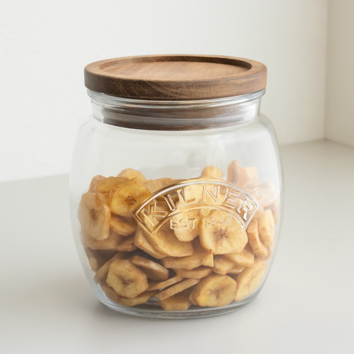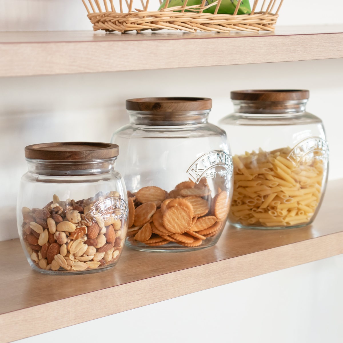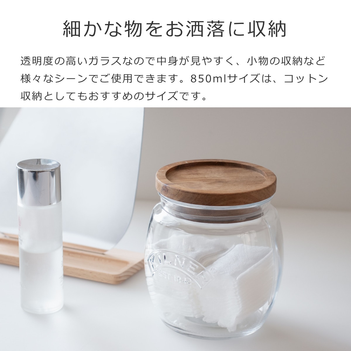 丸みのあるぽってりとした可愛らしいフォルムのガラスと、温もりのあるアカシア材を組み合わせた保存瓶です。エンボス加工で「KILNER」のロゴが施されており、何を入れてもお洒落に魅せてくれます。