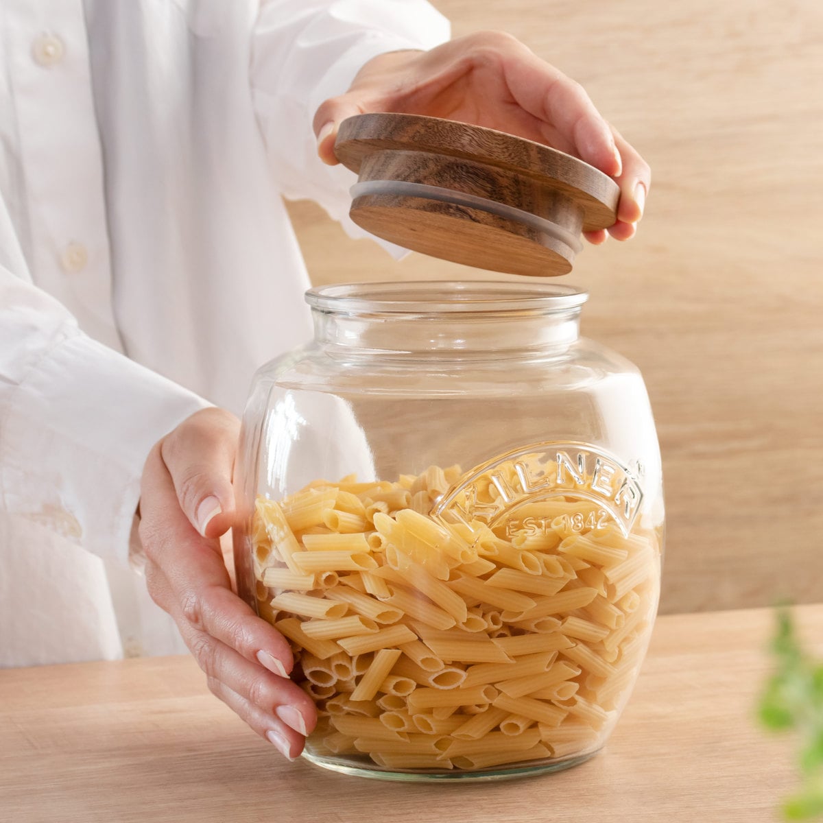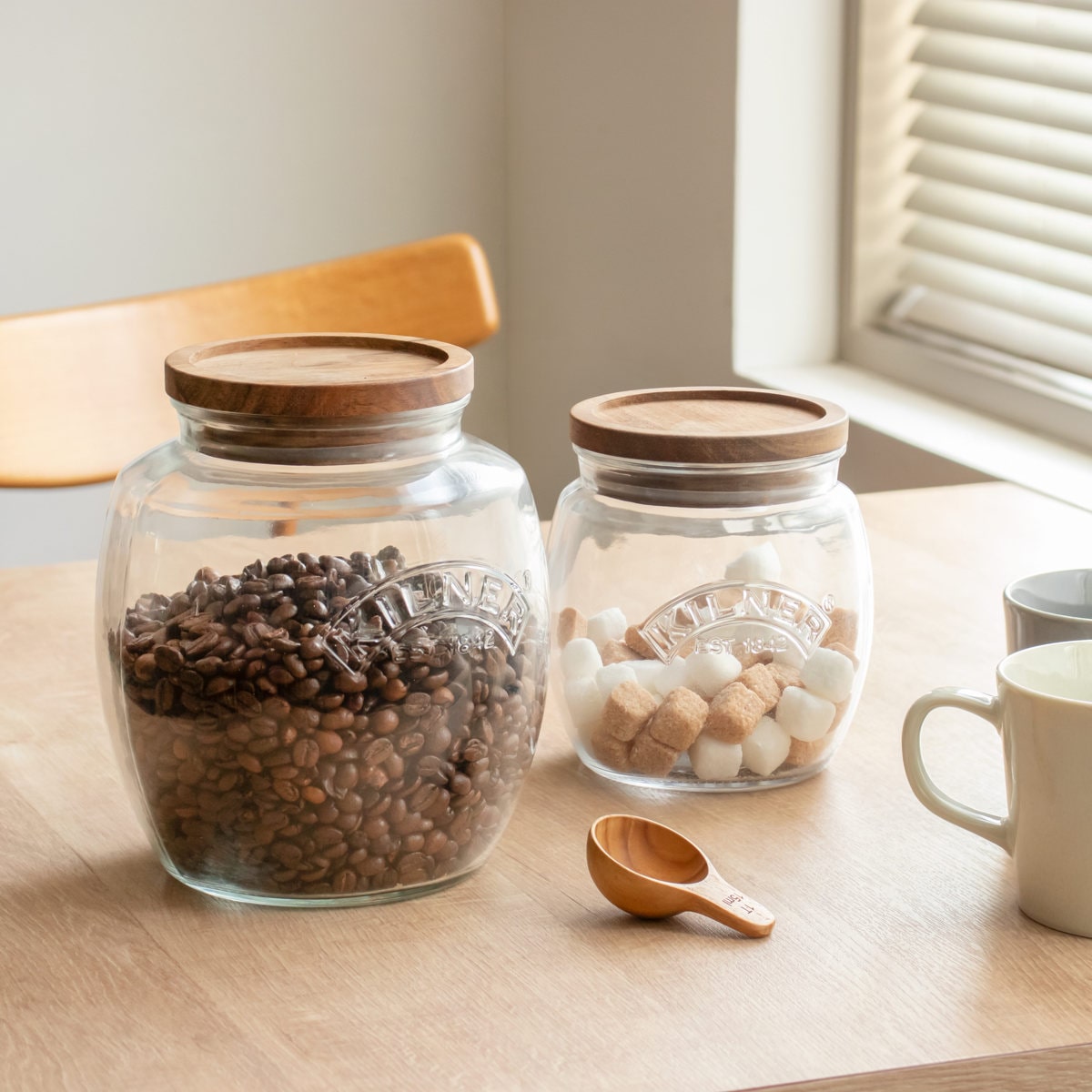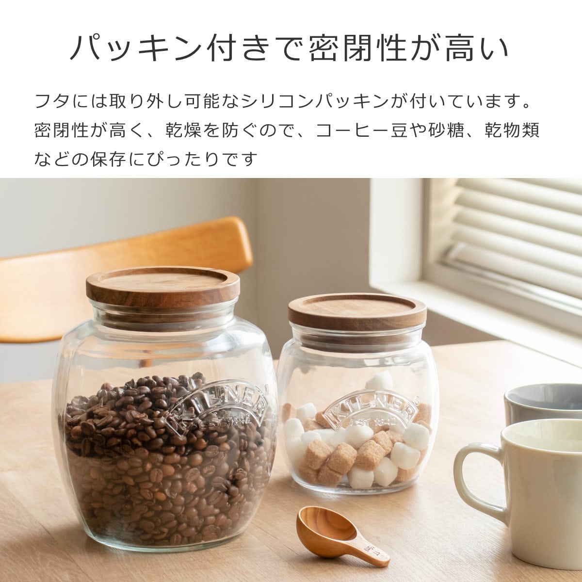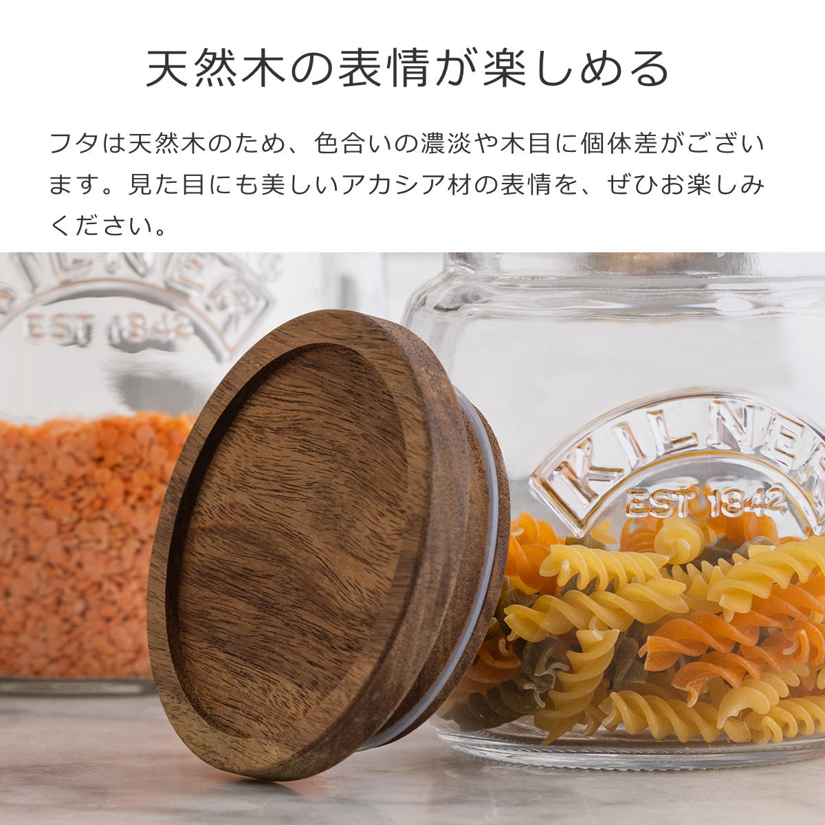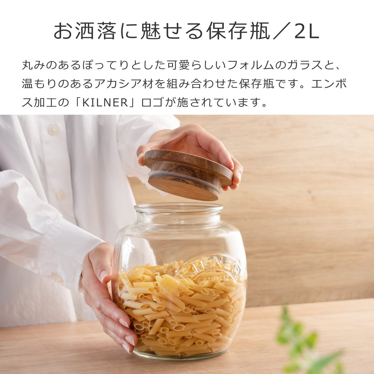 丸みのあるぽってりとした可愛らしいフォルムのガラスと、温もりのあるアカシア材を組み合わせた保存瓶です。エンボス加工で「KILNER」のロゴが施されており、何を入れてもお洒落に魅せてくれます。