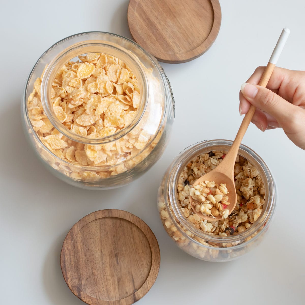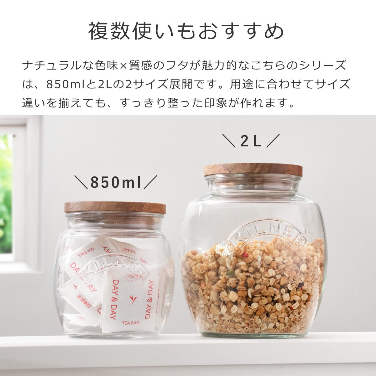 ナチュラルな色味×質感のフタが魅力的なこちらのシリーズは、0.85Lと2Lの2サイズ展開です。同じサイズでも、用途に合わせてサイズ違いを揃えても、すっきり整った印象が作れます。
