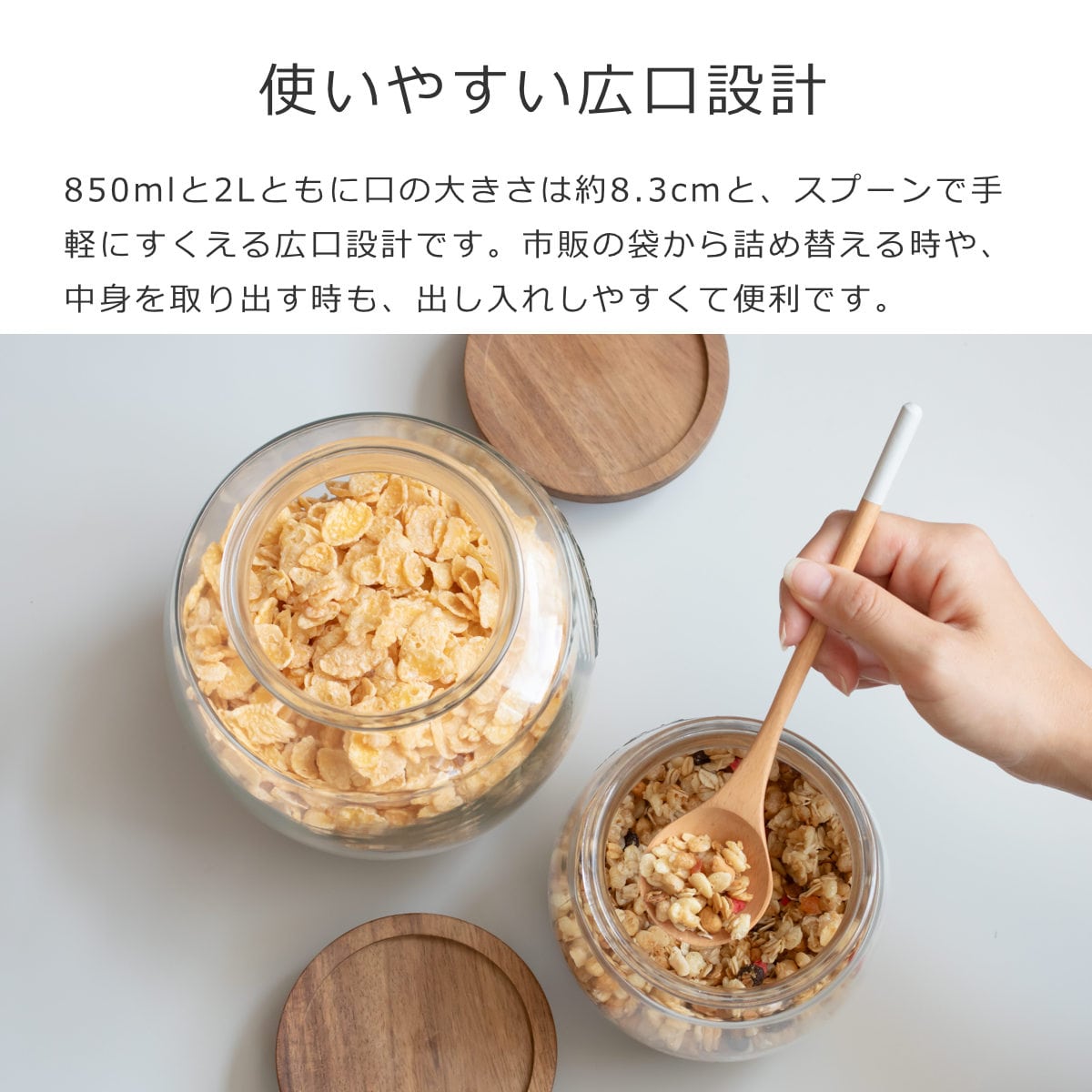 0.85Lと2Lともに口の大きさは約8.3cmと、スプーンで手軽にすくえる広口設計です。市販の袋から詰め替える時や、中身を取り出す時も、出し入れしやすくて便利です。