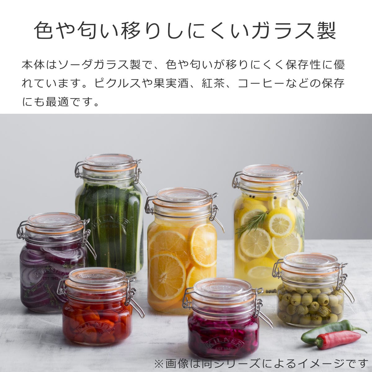本体はソーダガラス製で、色や匂いが移りにくく、塩分や酸に強い素材です。プラスチック製と違って、長期保存しても色汚れや匂い移りの心配がないため、ピクルスや果実酒、紅茶、コーヒーなどの保存にも最適です。