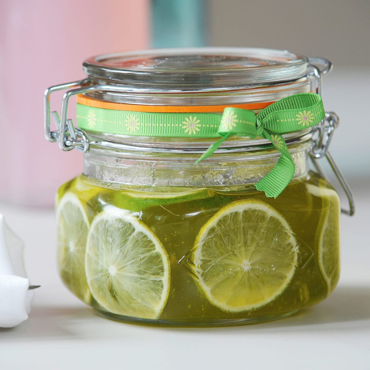 本体はソーダガラス製で、色や匂いが移りにくく、塩分や酸に強い素材です。プラスチック製と違って、長期保存しても色汚れや匂い移りの心配がないため、ピクルスや果実酒、紅茶、コーヒーなどの保存にも最適です。