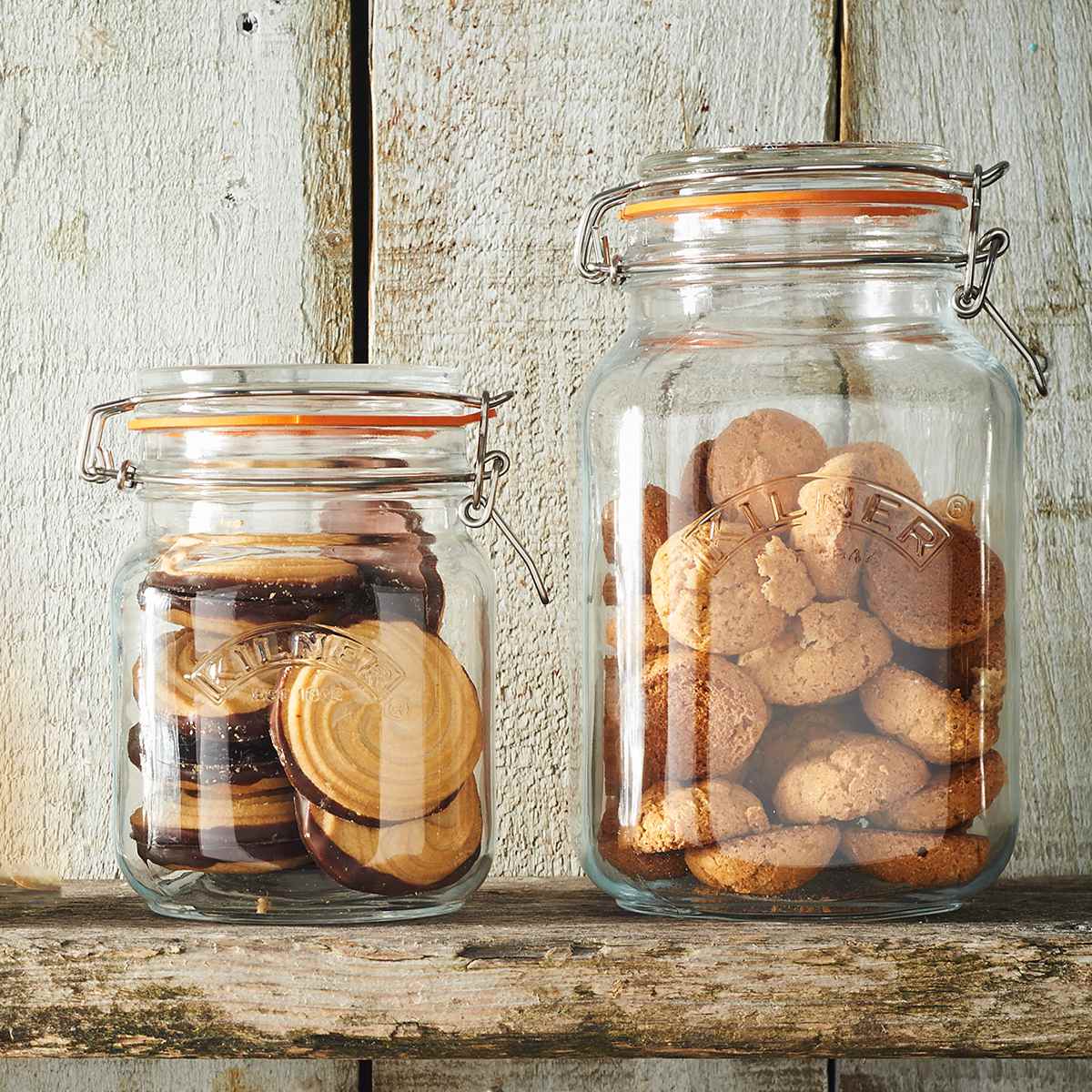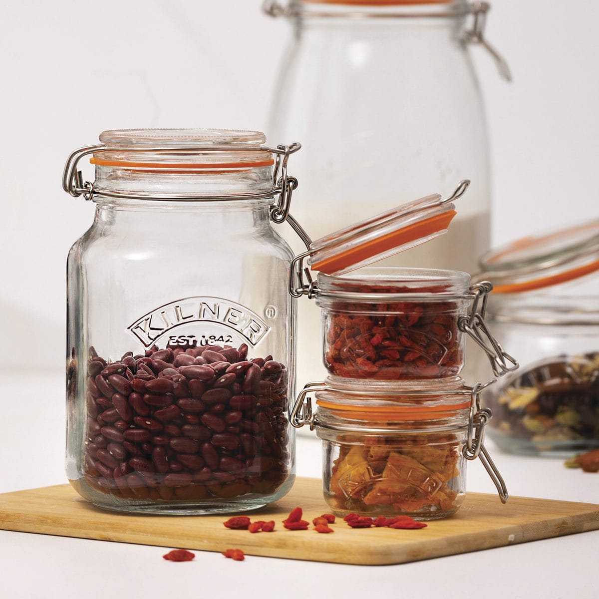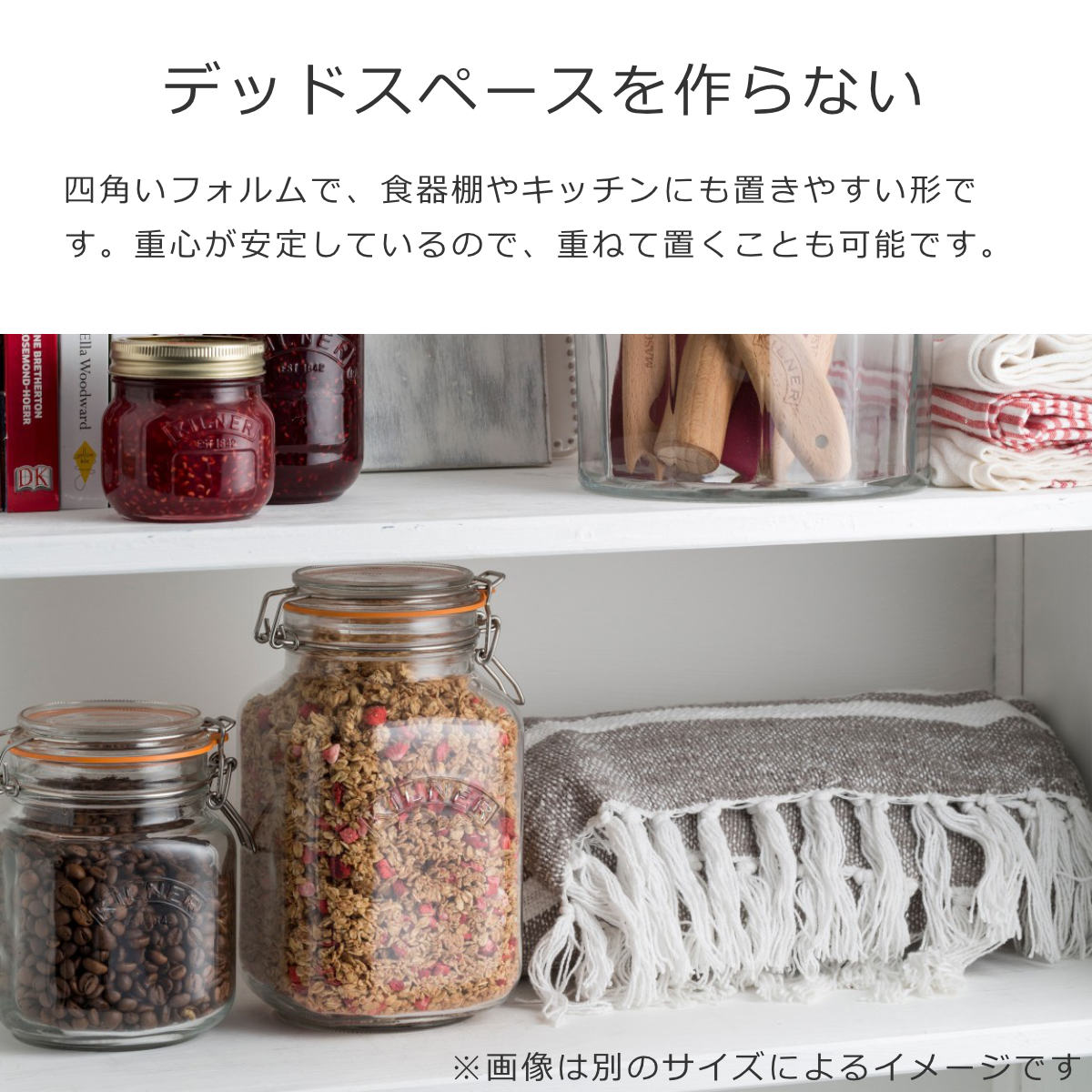 KILNERの保存瓶は、食材や用途に合わせて選べる豊富なサイズ展開です。単体での使用はもちろん、種類別で複数使いすれば、キッチンが整って統一した空間が生まれます。