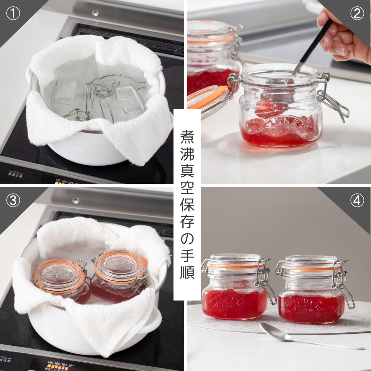 1、沸騰したお湯にパッキンを外した瓶を入れて煮沸します。瓶が割れるのを防ぐため、鍋の底に布巾などを敷いてください。
