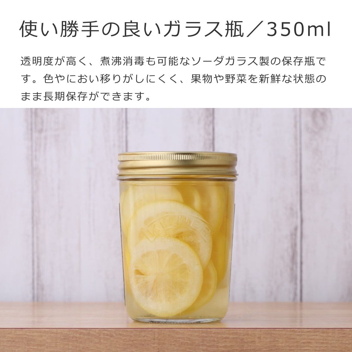 透明度が高く、煮沸消毒も可能なソーダガラス製の保存瓶です。色やにおい移りがしにくく、果物や野菜を新鮮な状態のまま保存できるので、果実酒やピクルスなど長期保存する食材にも適しています。