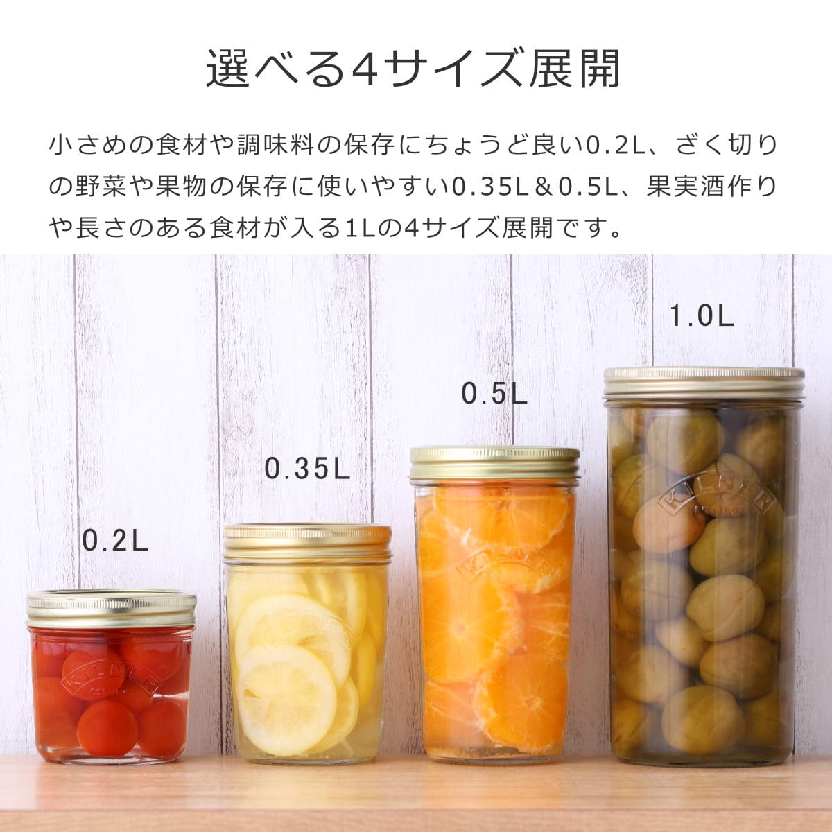 ワイドマウスプリザーブジャーは、小さめの食材や調味料の保存にちょうど良い0.2L、ざく切りの野菜や果物の保存に使いやすい0.35L&0.5L、果実酒作りや長さのある食材が入る1Lの4サイズ展開です。