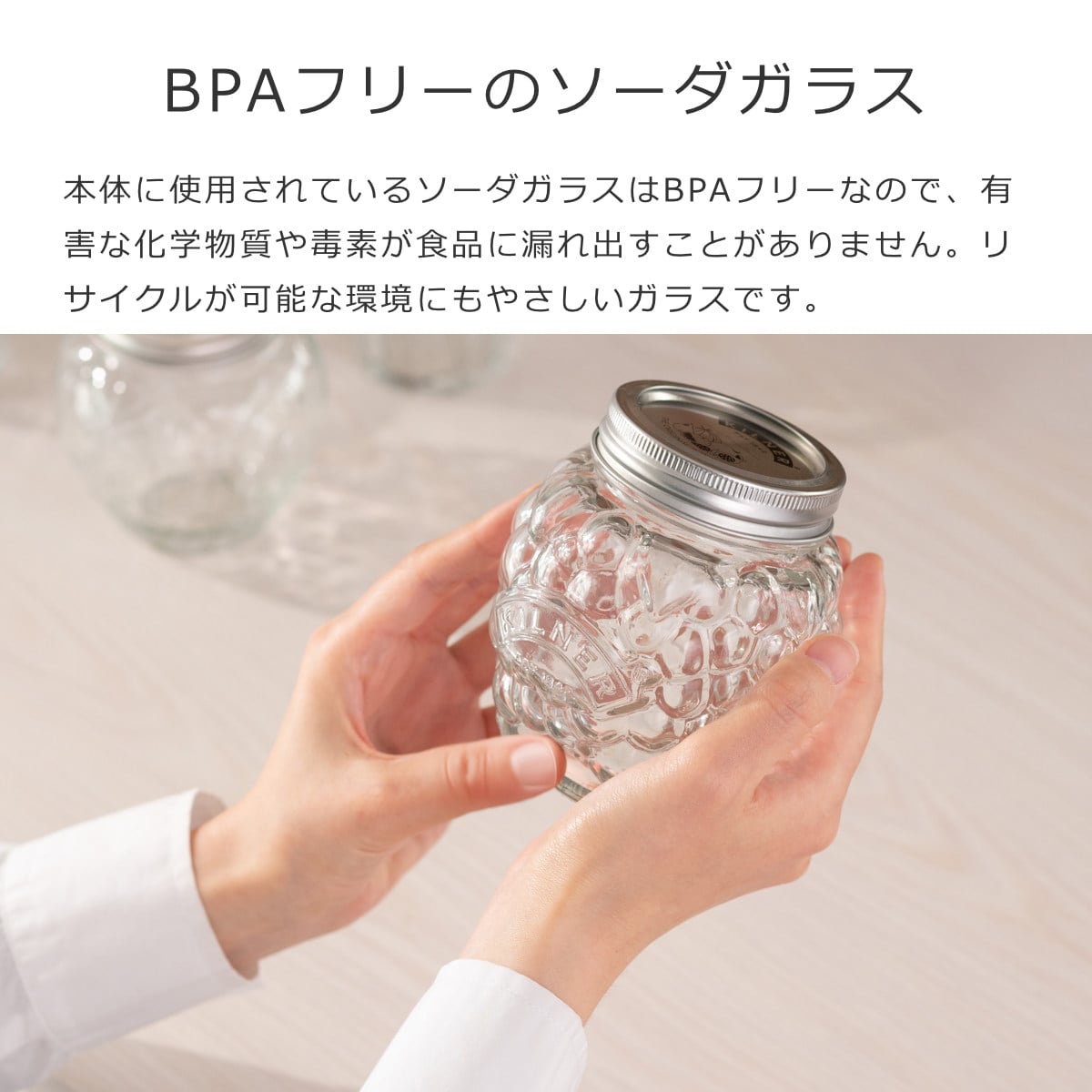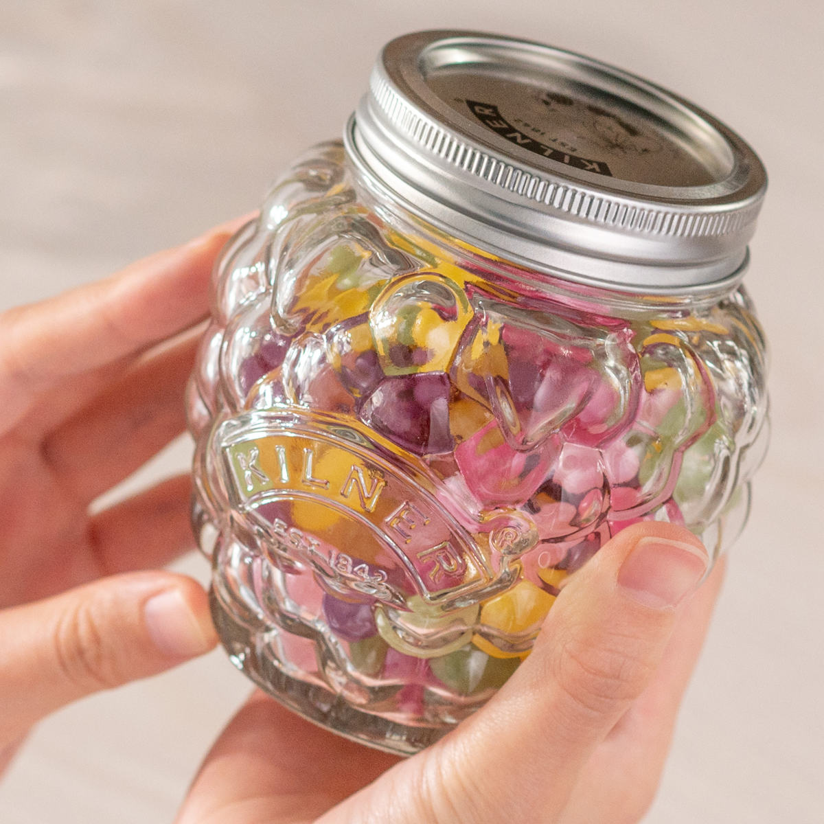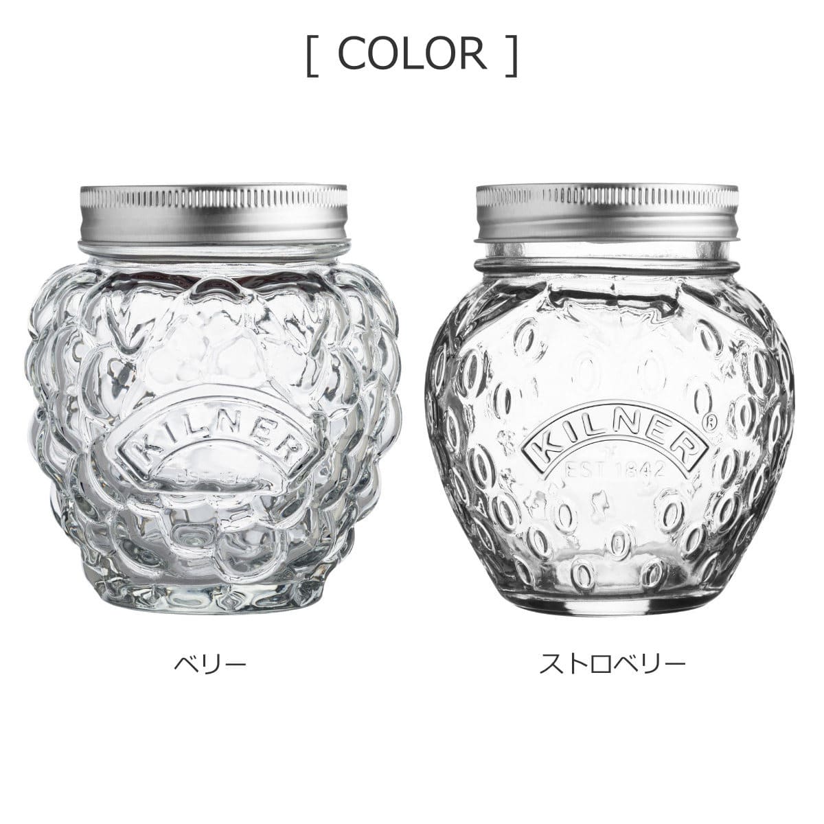 ストロベリーとベリーをモチーフにしたガラス製の保存容器です。正面にエンボス加工の「KILNER」のロゴがあり、表面には苺やベリーの果実のような凹凸が全体に施されています。中に入れる物やカラーによって、様々な表情が楽しめるデザインです。