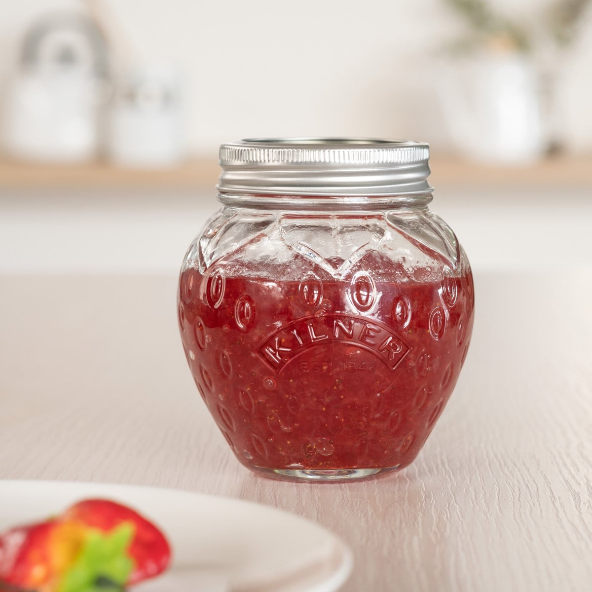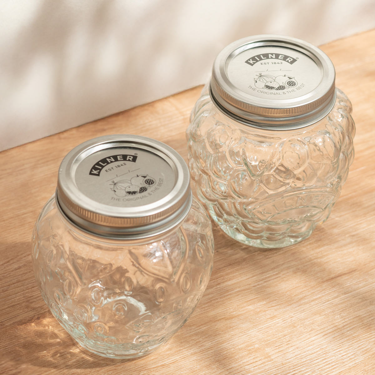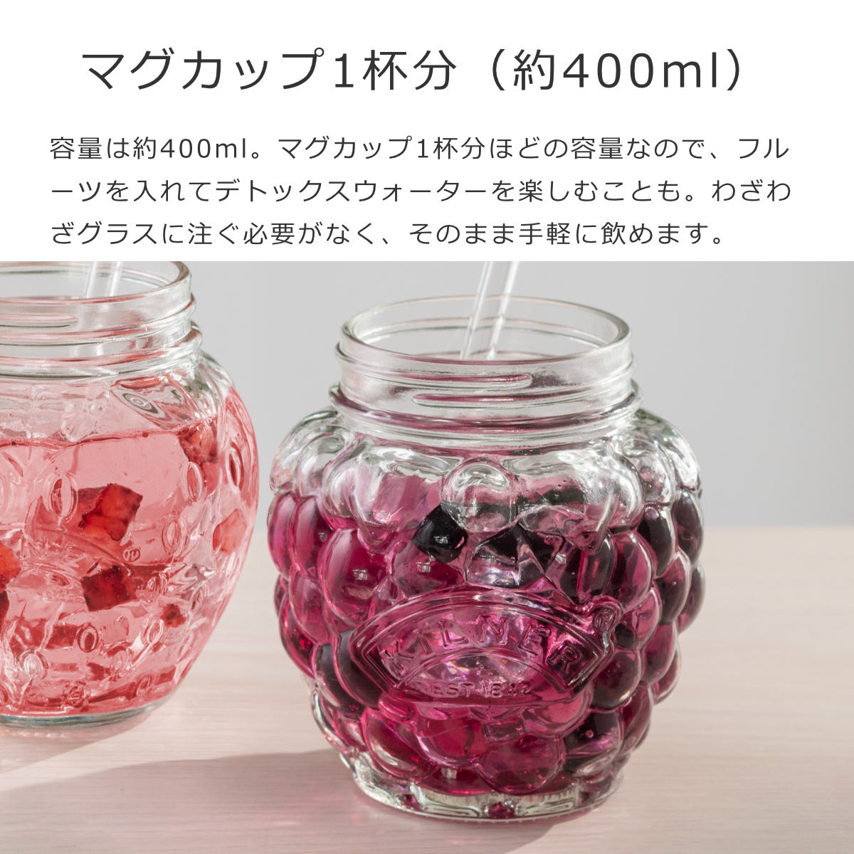 ストロベリーとベリーをモチーフにしたガラス製の保存容器です。正面にエンボス加工の「KILNER」のロゴがあり、表面には苺やベリーの果実のような凹凸が全体に施されています。中に入れる物やカラーによって、様々な表情が楽しめるデザインです。