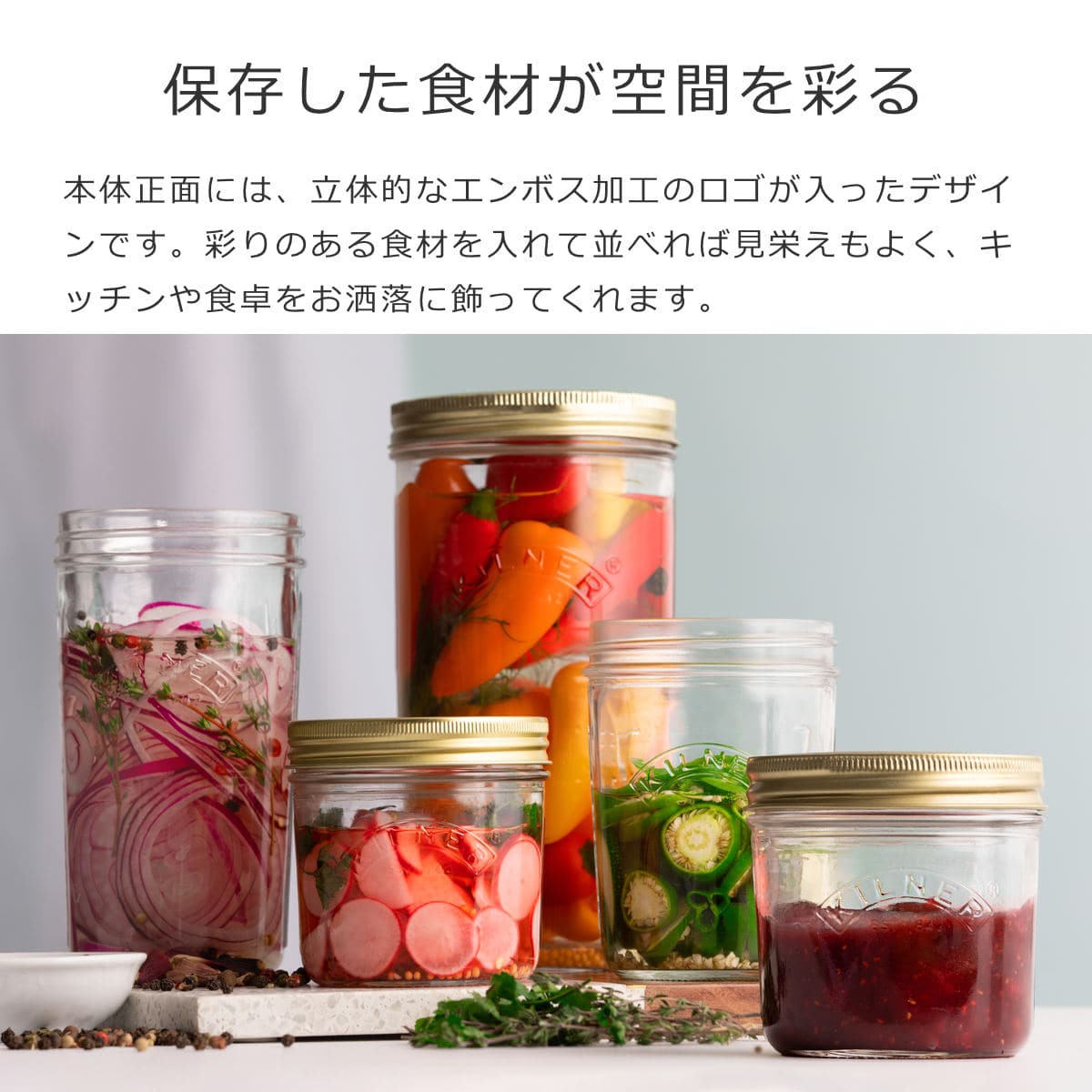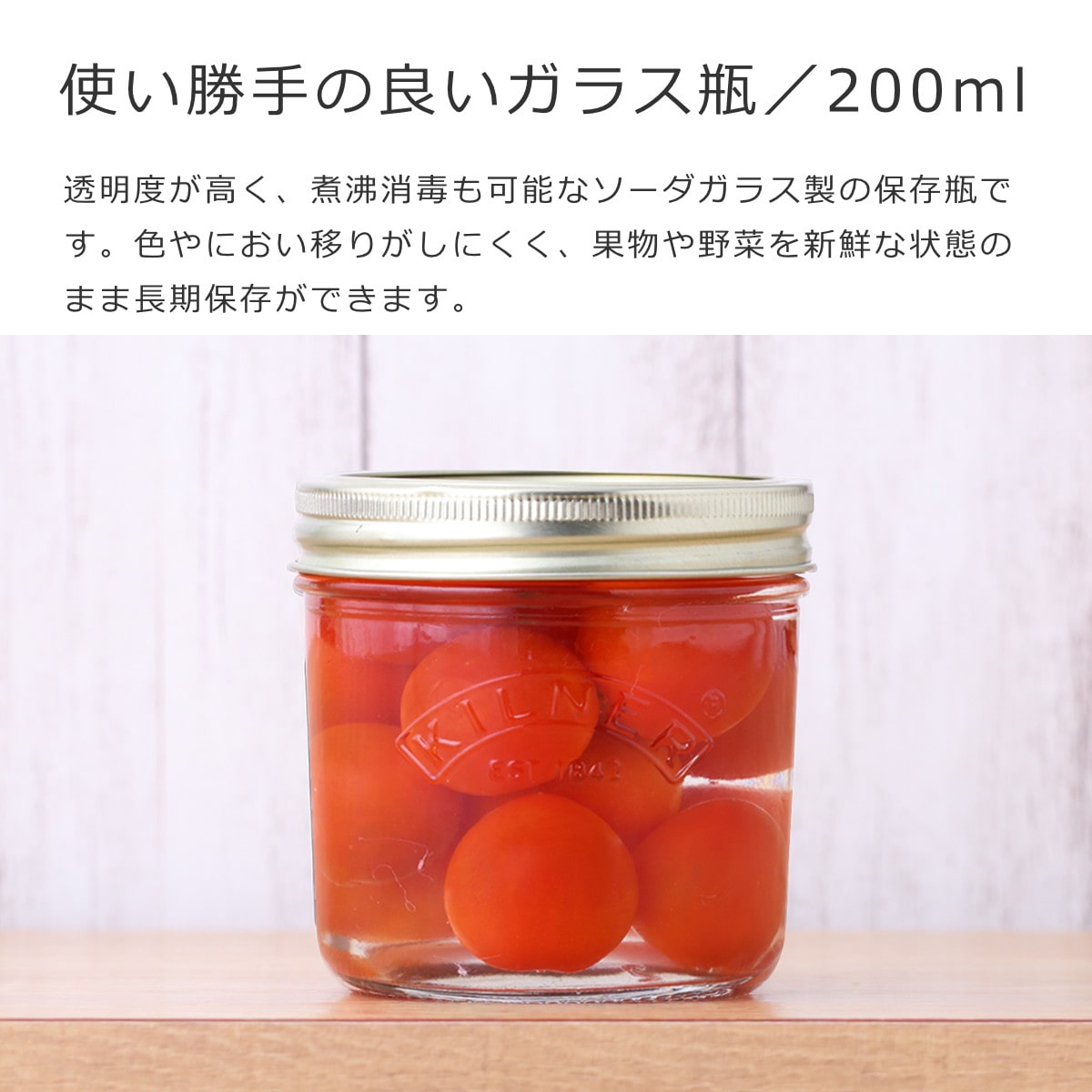 透明度が高く、煮沸消毒も可能なソーダガラス製の保存瓶です。色やにおい移りがしにくく、果物や野菜を新鮮な状態のまま保存できるので、果実酒やピクルスなど長期保存する食材にも適しています。