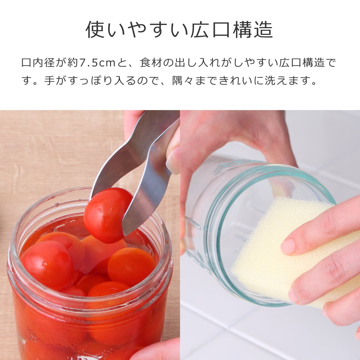 口内径が約7.5cmと、食材の出し入れがしやすい広口構造です。手がすっぽり入るので、隅々まできれいに洗えます。