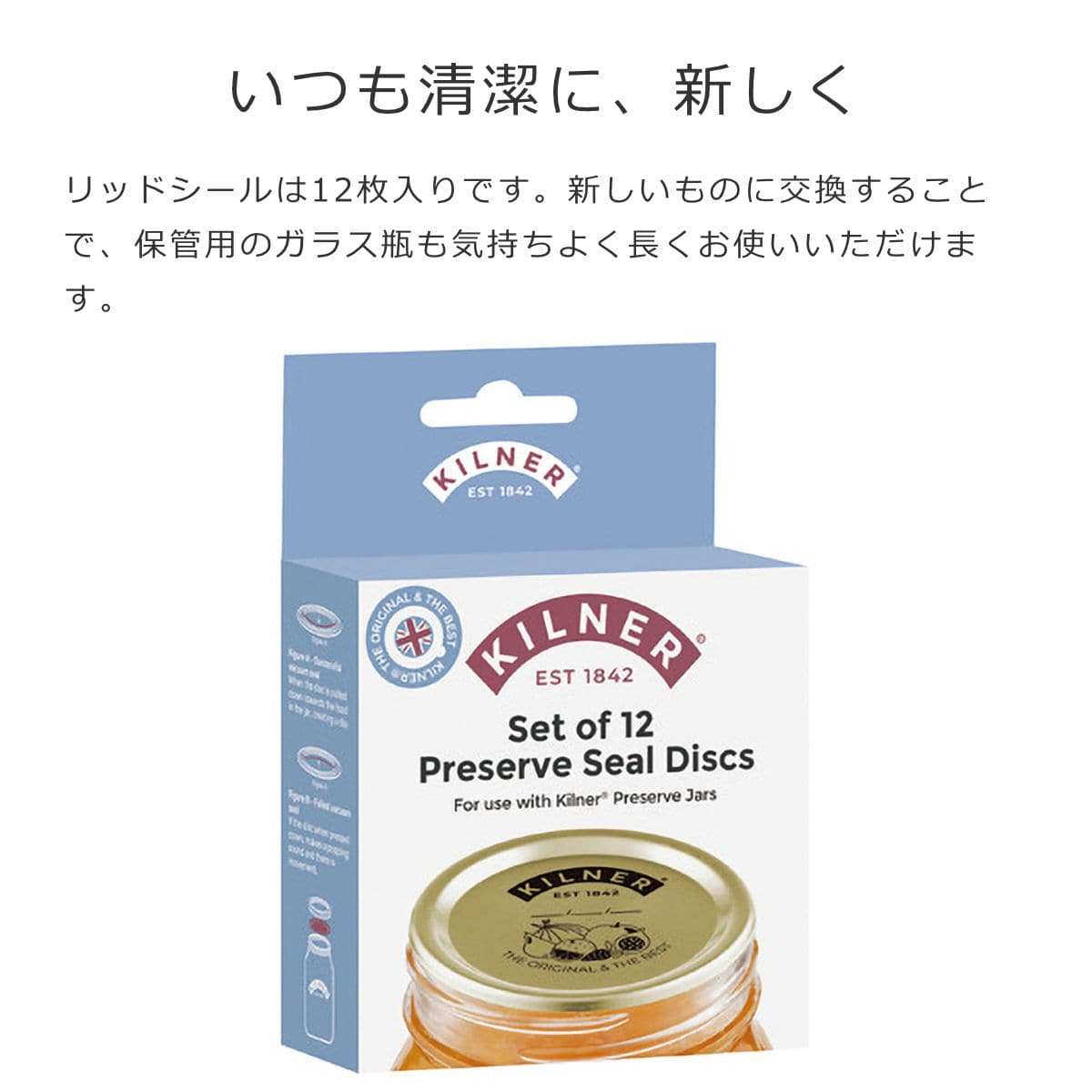 リッドシールは12枚入りです。新しいものに交換することで、保管用のガラス瓶も気持ちよく長くお使いいただけます。