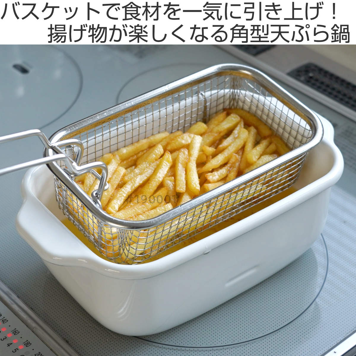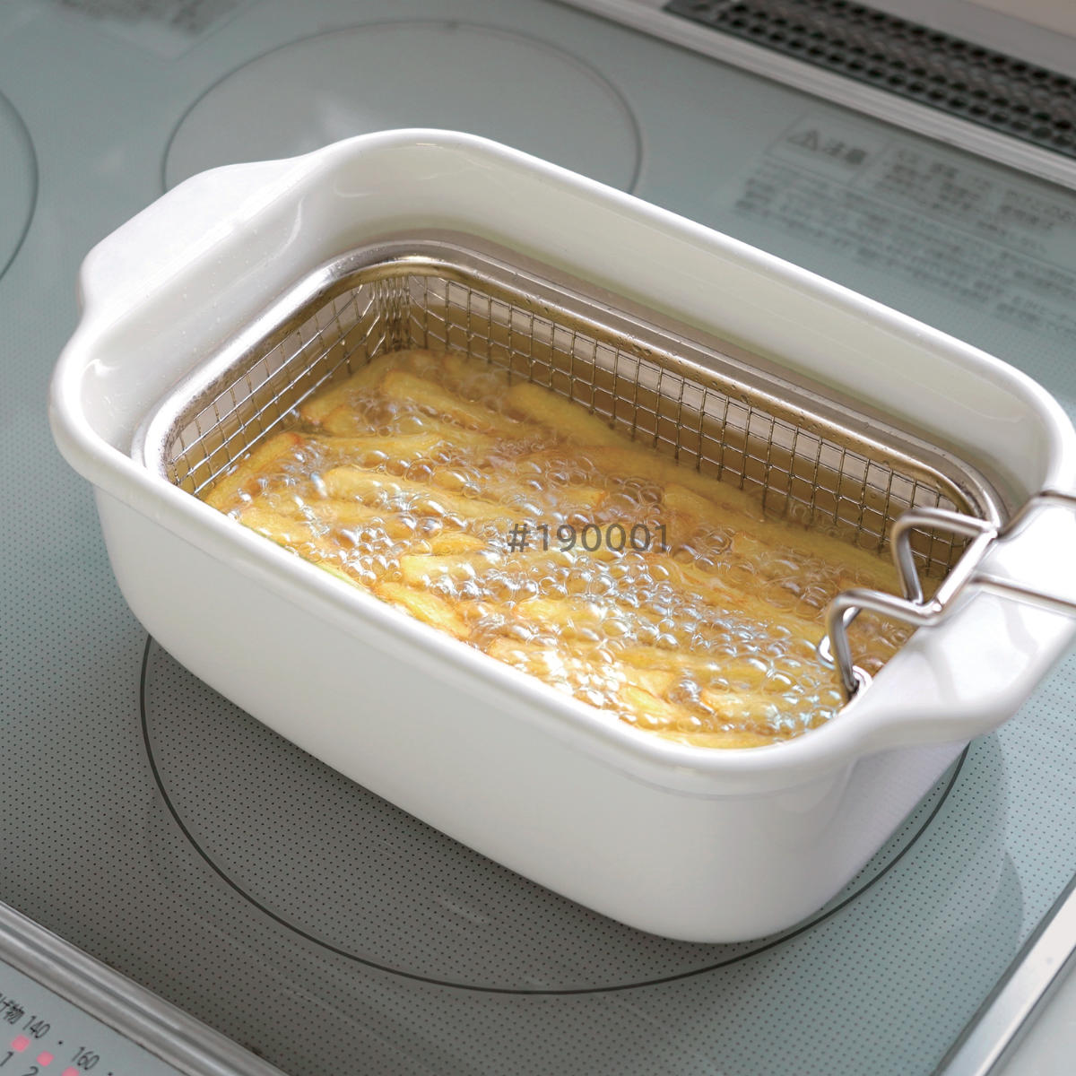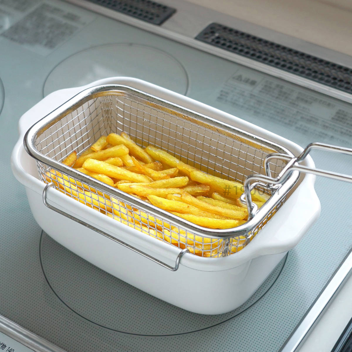 大人気「角型天ぷら鍋」のセットに、フライヤーバスケットが追加されました。1個ずつ菜箸で掴むのが面倒なポテトや唐揚げなど一気に取り出すことができてとっても便利です。側面フックを鍋の縁に引っ掛ければ、手を離した状態で油切りができます。