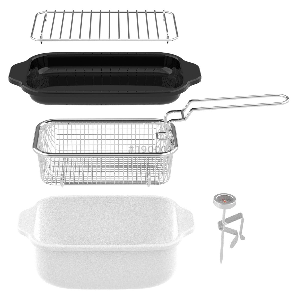 防水型の温度計・バスケット・バット・すのこ網がセットになっているので、手軽に揚げ物料理にチャレンジできます。バットは下準備にも使え、調理中は網を組み合わせて油切りの受け皿として使用できます。調理中の温度管理に便利な温度計は、220度まで測定可能です。