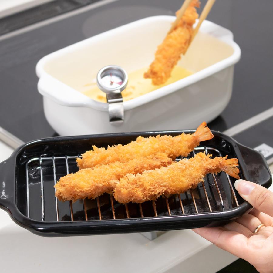 四角い形は、アスパラガスやエビフライのような長い食材の調理にぴったり。少ない油で揚げ物に十分な深さを確保できるのも嬉しいポイントです。