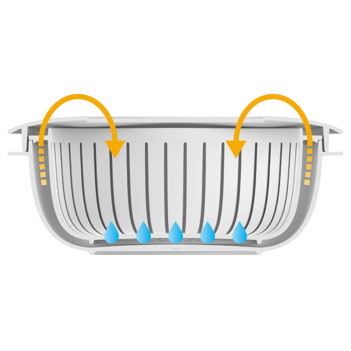 縦方向に長くスリットが入ったザルは、食材の水切りにも重宝します。少量の野菜や果物を洗って、そのまま容器ごと冷蔵庫へ。ザルで水切りしながら、フタで乾燥を防いでそのまま保存が可能です。