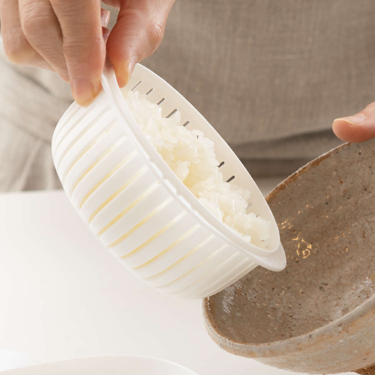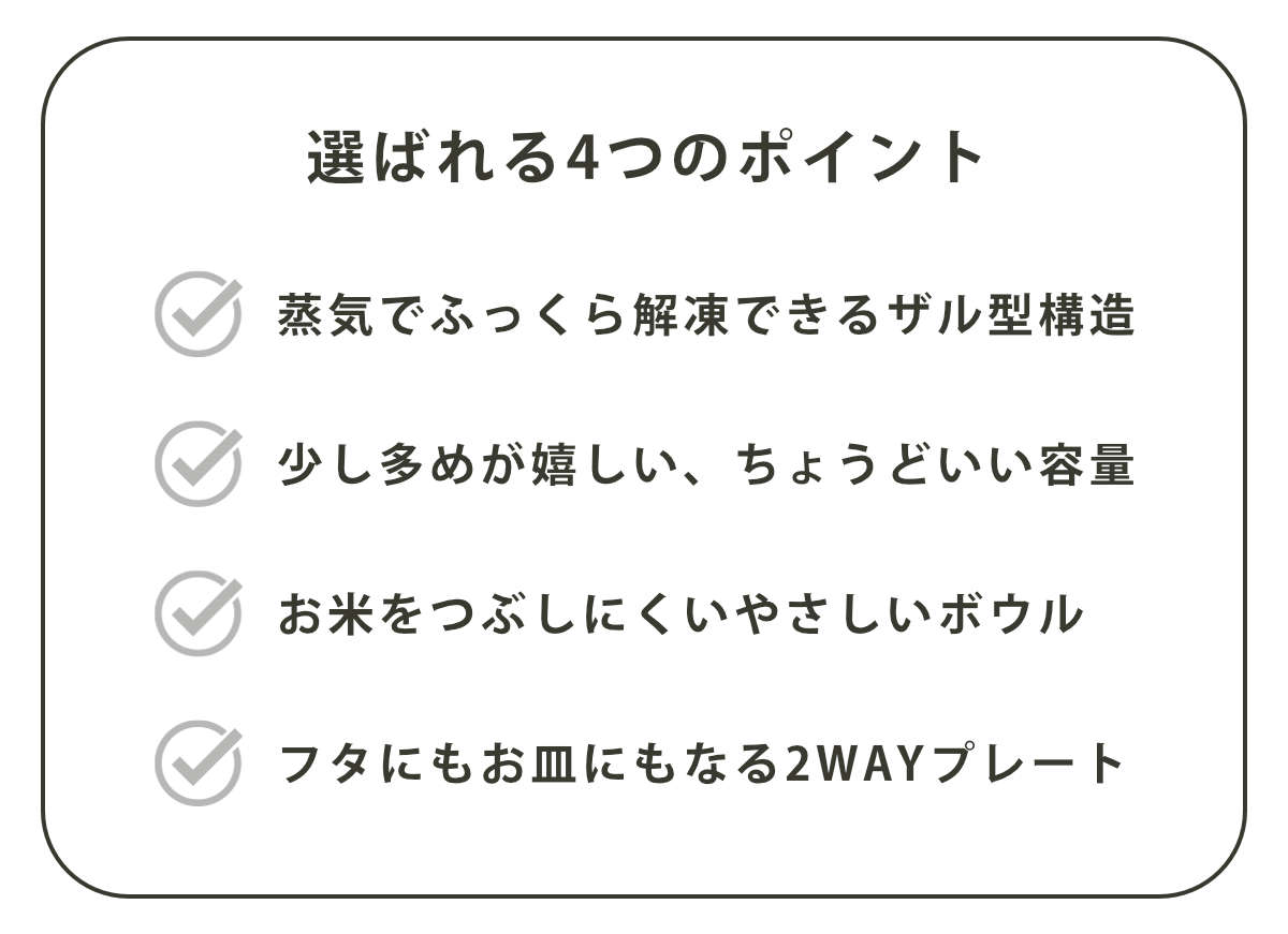 レンジ加熱で蒸気がムラなく循環し、余分な水分を下に落としてふっくら仕上げます。ザル上部の穴からも蒸気が抜ける構造で、冷凍ごはんも効率よくおいしく加熱でき、美味しさをしっかり楽しめます。