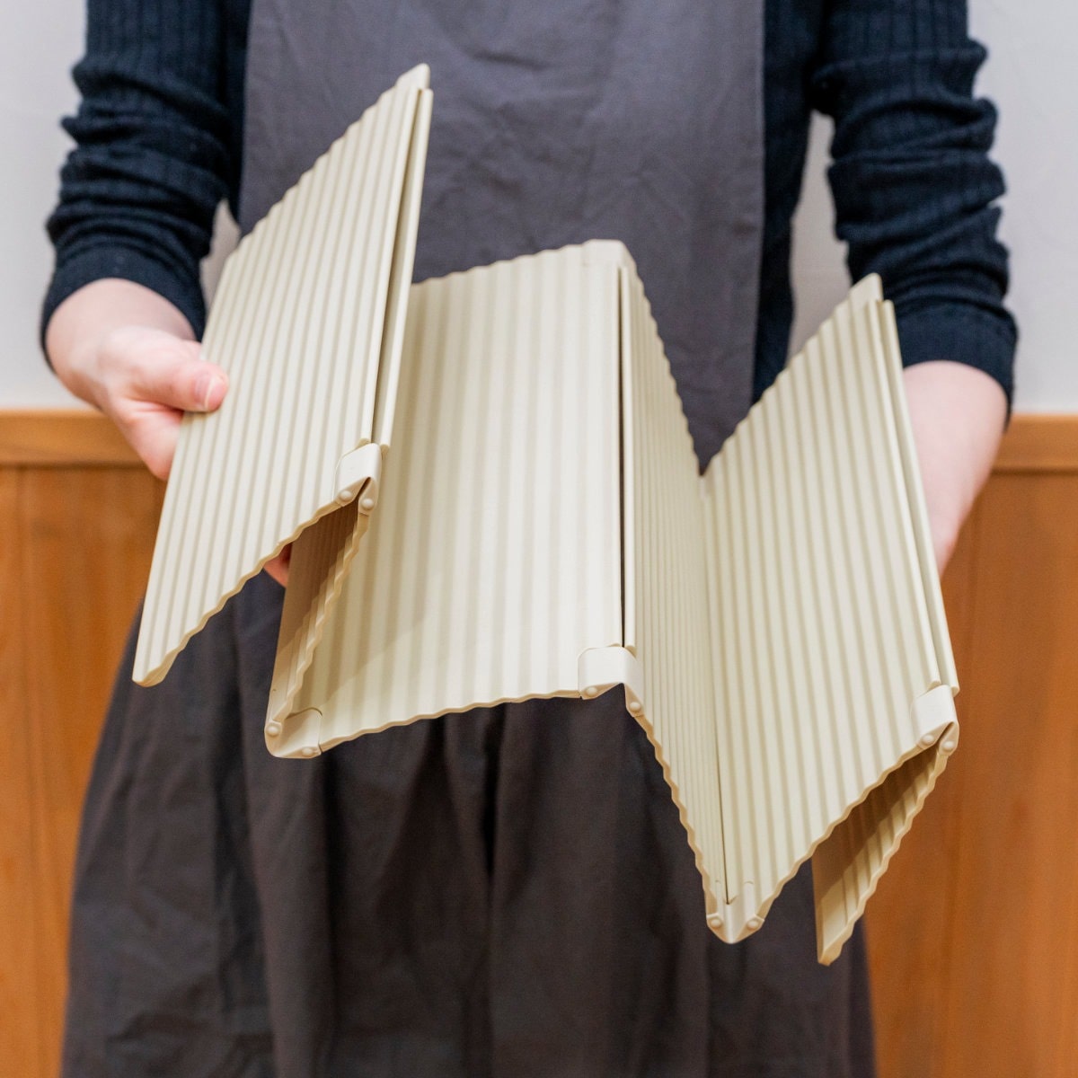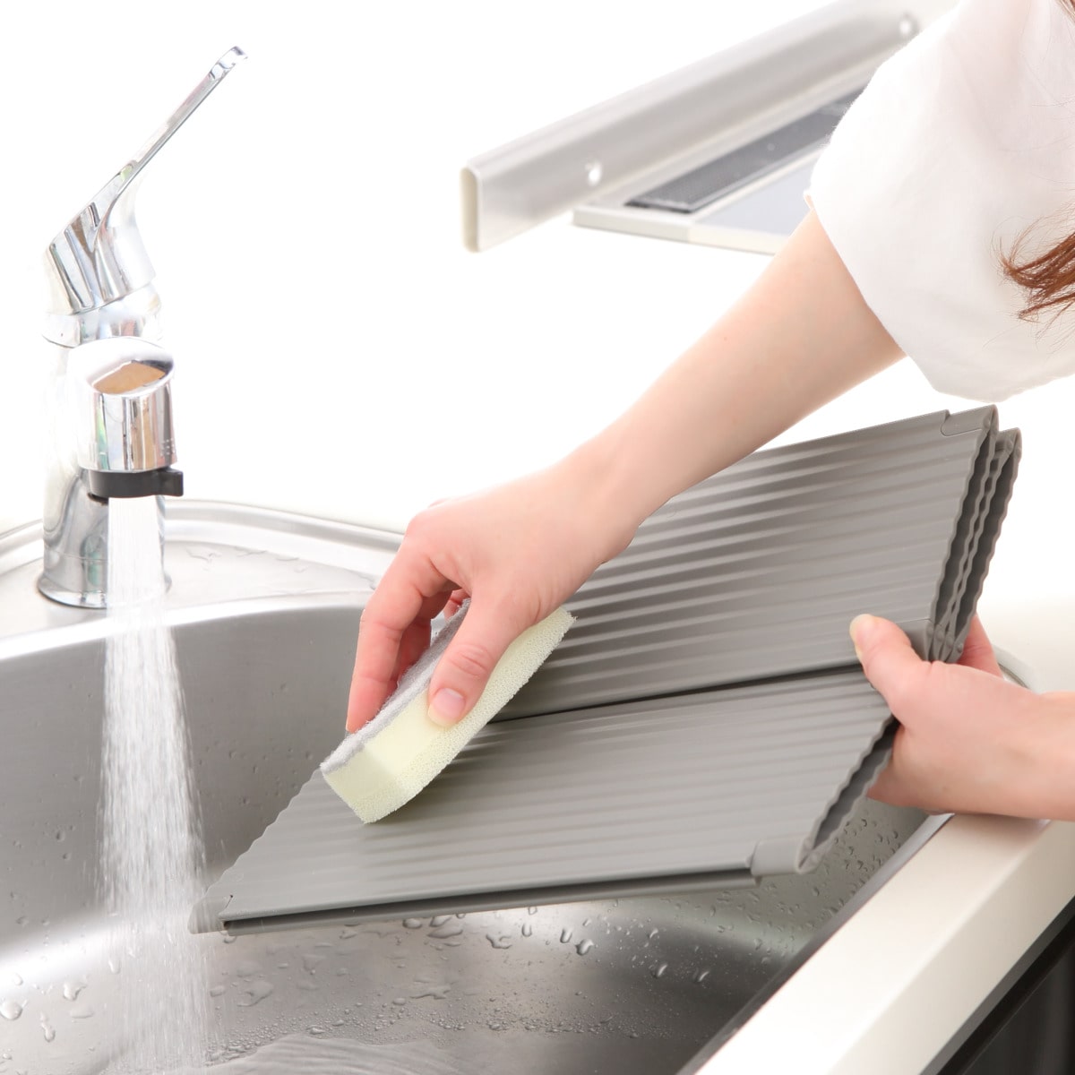 広さの限られたシンク内でも折りたたみながらスムーズに洗えるコンパクトさ。柔らかい樹脂製で角のないパネルなので、シンクを傷つけにくく洗いやすいです。