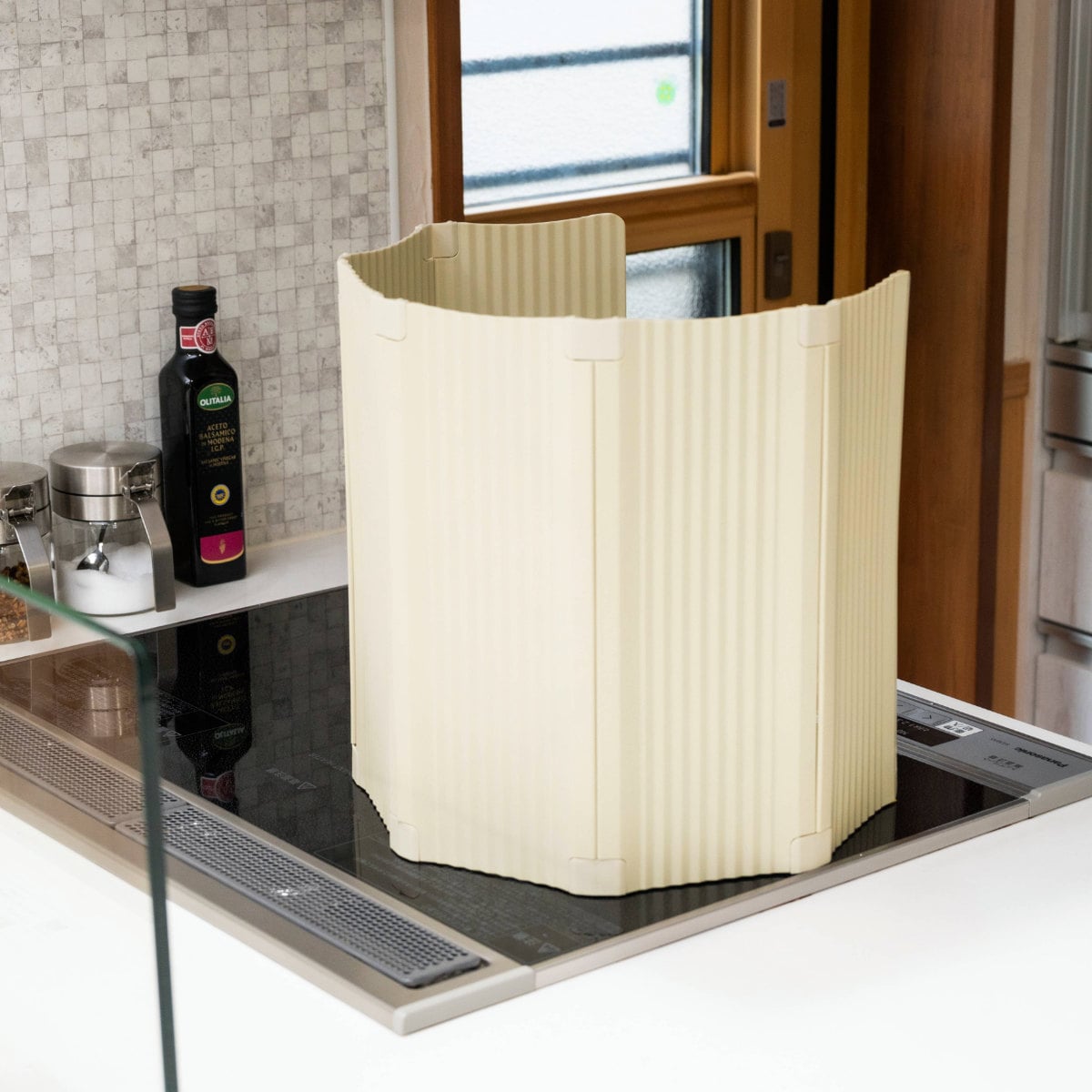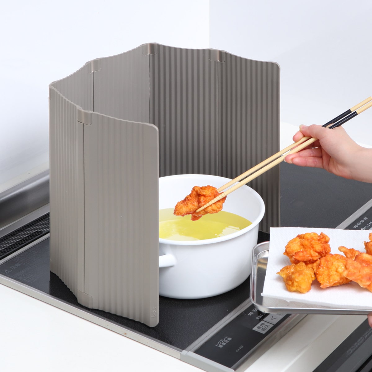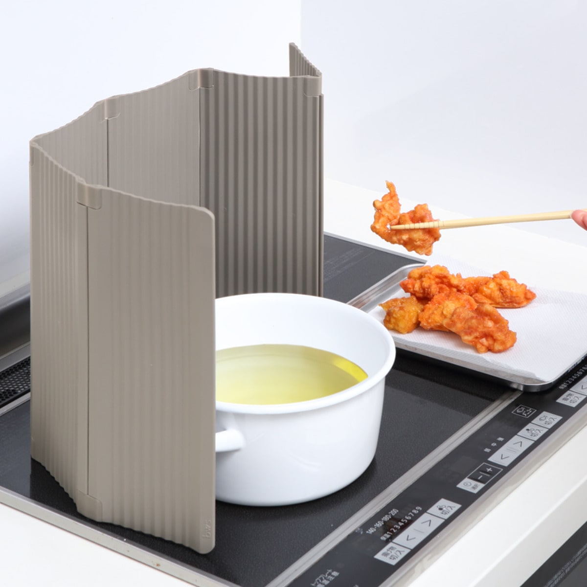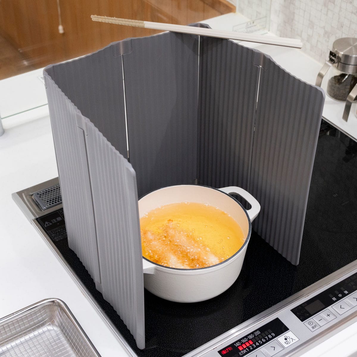 調理中に飛び散る汚れをしっかりガードできる便利な油はねガードです。フライパンや鍋をサッと囲うだけ。キッチンの壁などに飛び散る汚れを防いでくれて、キッチン掃除の時短につながる優れものです。