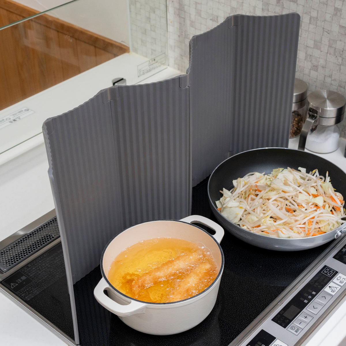 調理方法に合わせて使いやすく形を変えられる6枚パネルです。1つのコンロを囲う使い方はもちろん、大きく広げて2つのコンロを囲ったりと自由自在。同時調理をする際にも重宝します。
