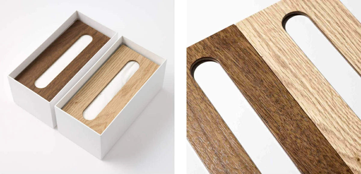 プラスチック素材と木蓋の異素材ミックスが目を引くティッシュケースです。天然木を使ったリバーシブル木蓋はインテリアに合わせて使い分けができます。天然木は木目の出方がそれぞれ異なるため、ひとつひとつ違った表情をお楽しみいただけます。