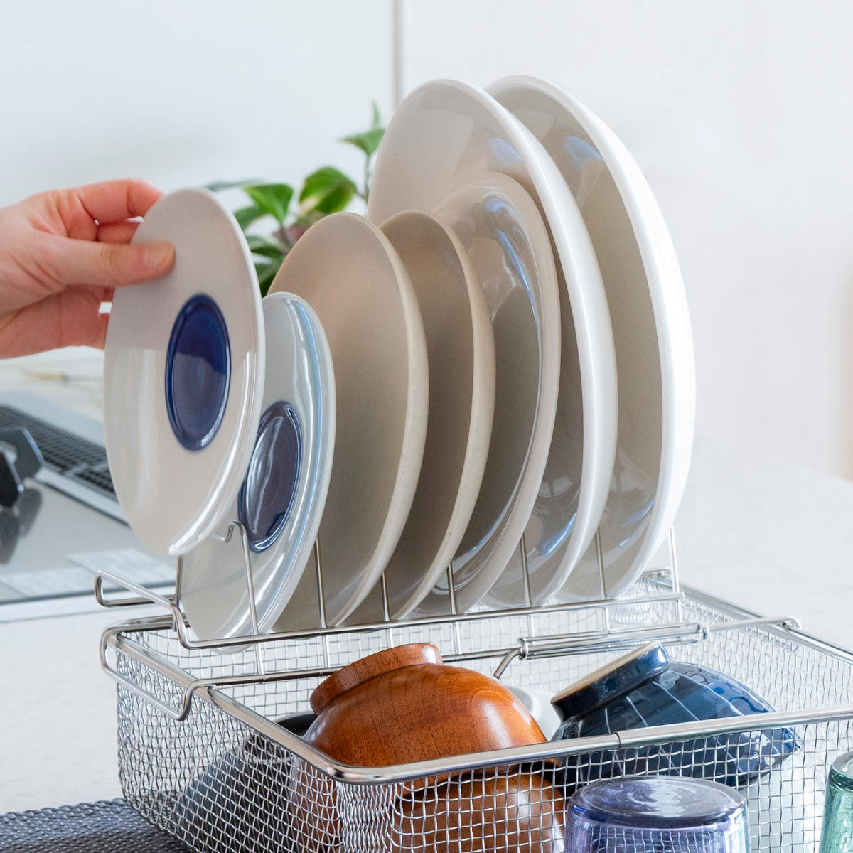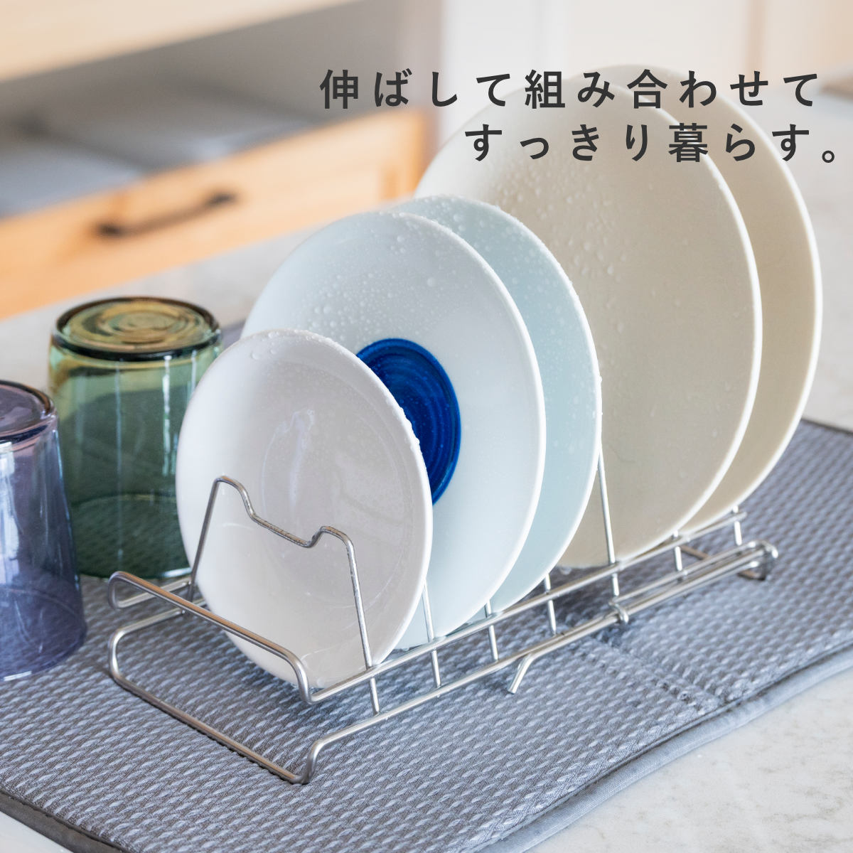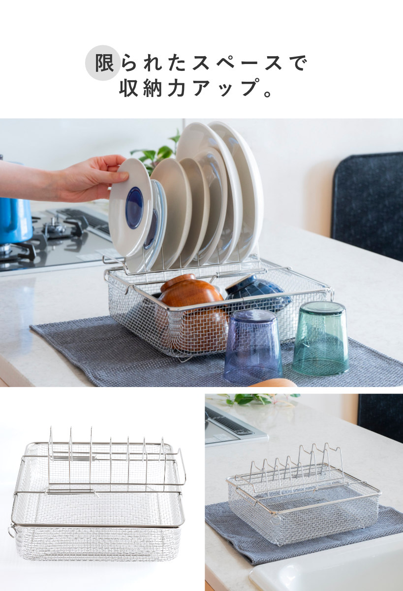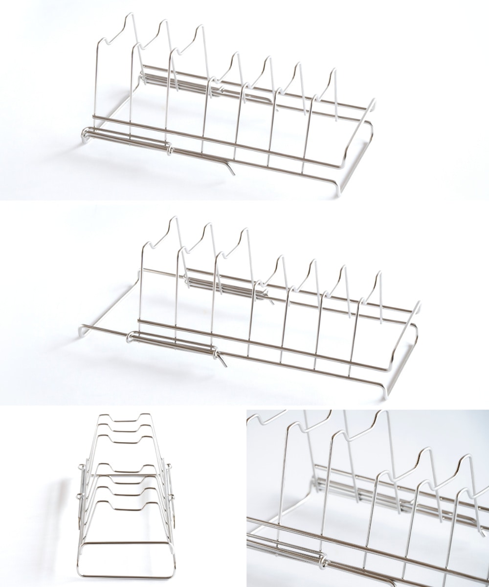 すっきり暮らす水切りかごと組み合わせて使うのにぴったりなディッシュラックです。すっきり暮らす水切りかごでは立てられない平皿を立てて乾かせます。水切りかごに加えるだけで、さらに快適な暮らしが始まります。