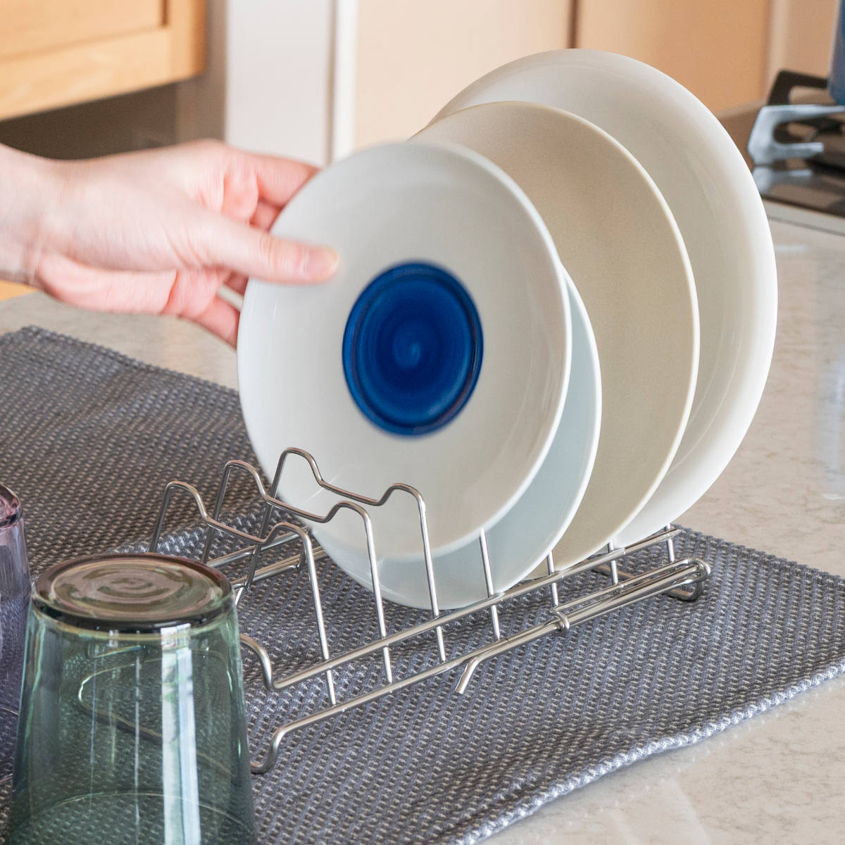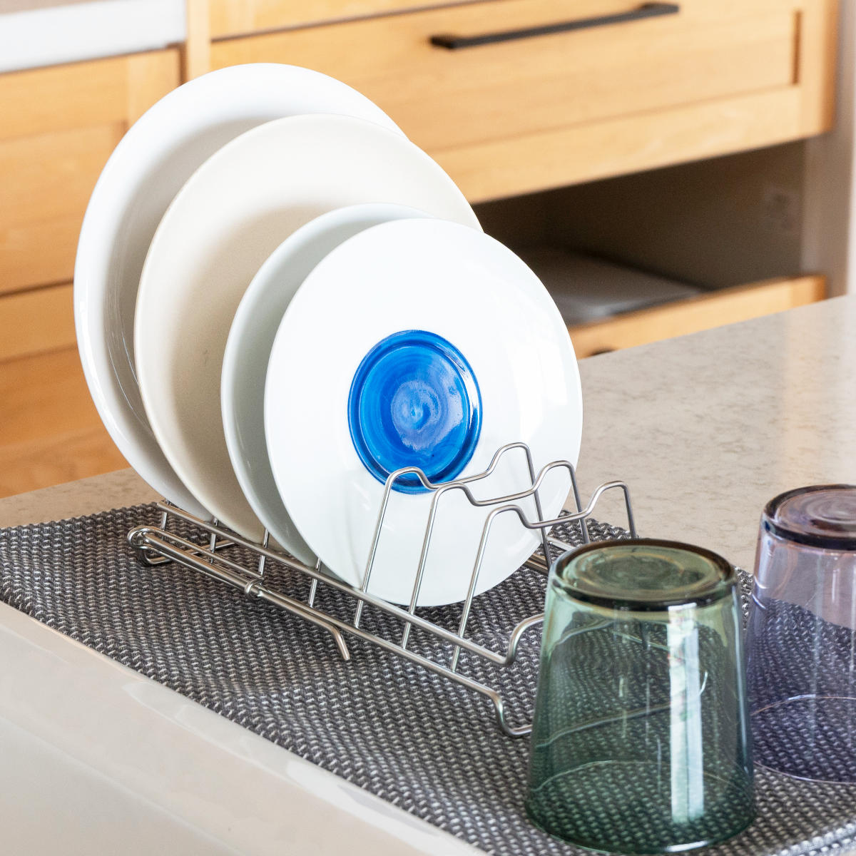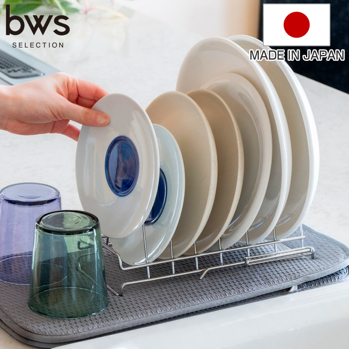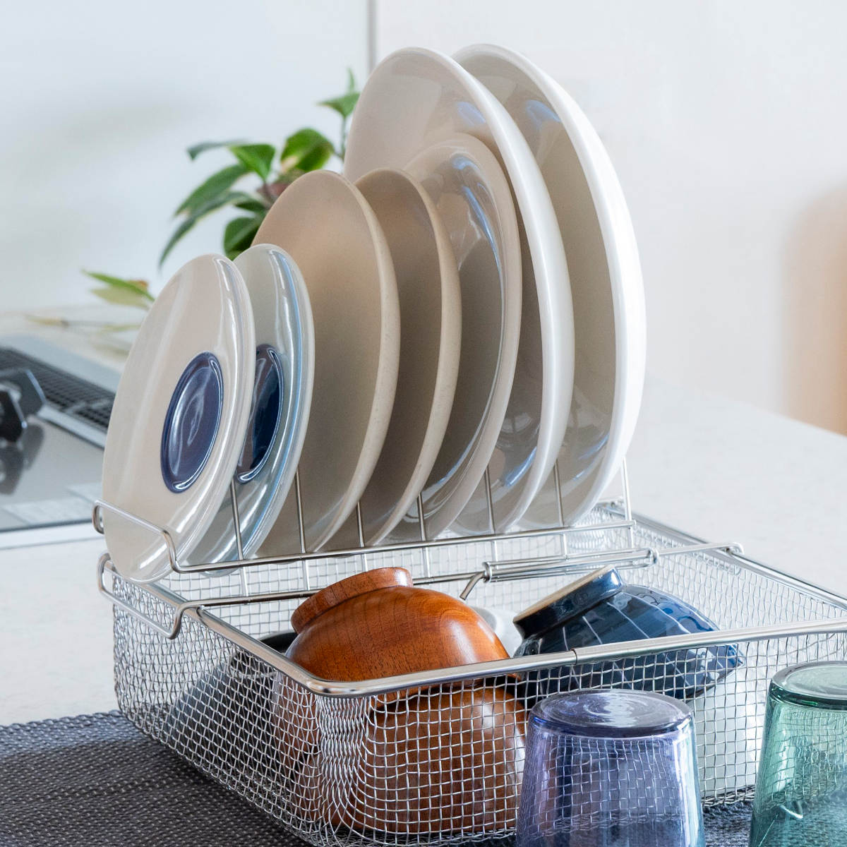 すっきり暮らす水切りかごと組み合わせて使うのにぴったりなディッシュラックです。すっきり暮らす水切りかごでは立てられない平皿を立てて乾かせます。水切りかごに加えるだけで、さらに快適な暮らしが始まります。