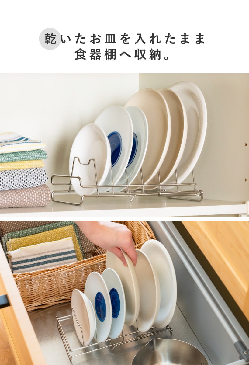 棚や引き出し内での収納にもおすすめ。シンク下や食器棚の空いたスペースにラックごと収納して食事の際に取り出すだけ。乾いた食器をひとつひとつ食器棚に戻す手間が省けます。