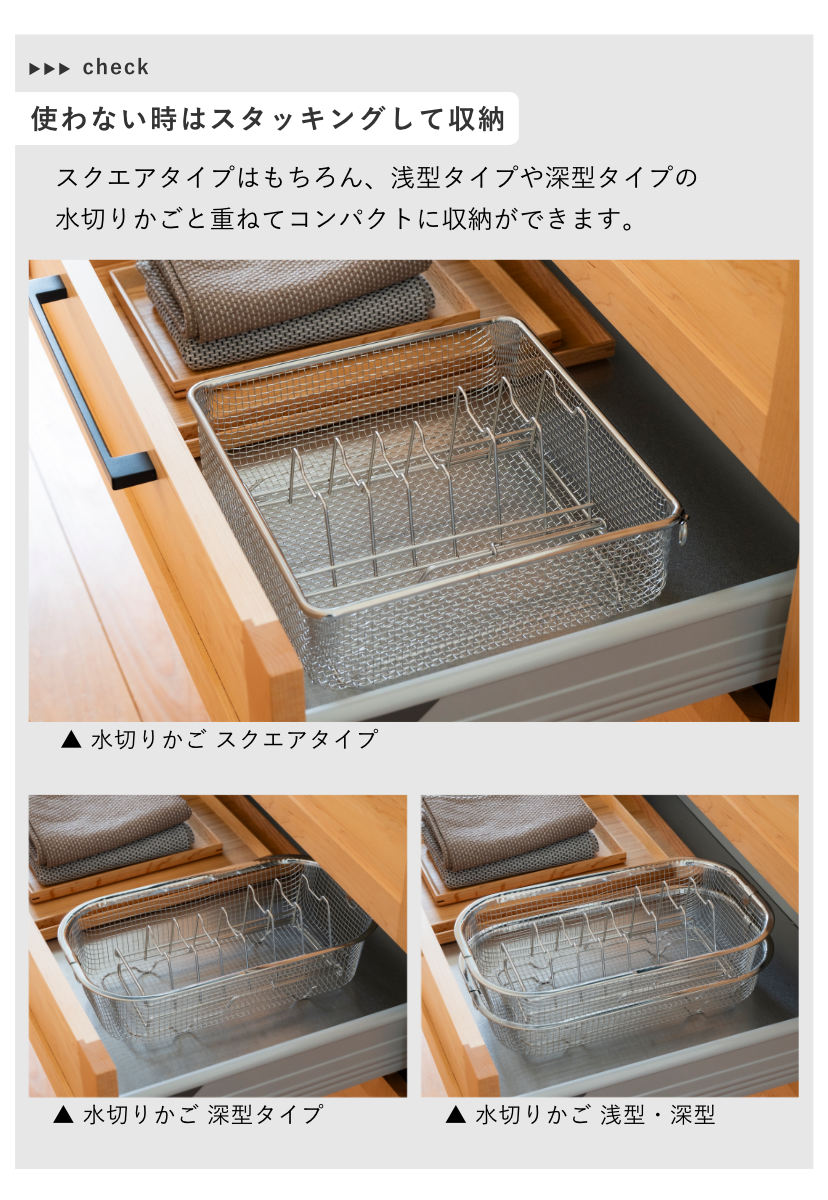 ![]() 水切りかご スクエア | ![]() 水切りかご 浅型 | ![]() 水切りかご 深型 |