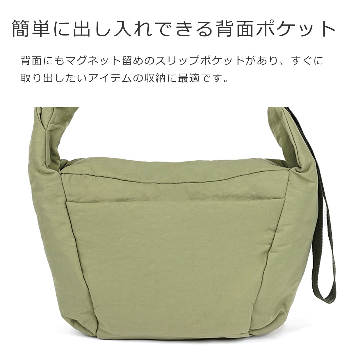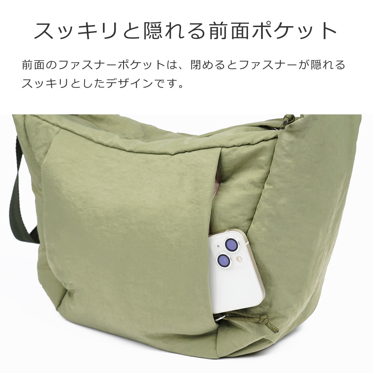 撥水加工を施したナイロン100%素材を使用しており、雨の日やアウトドアシーンでも気軽に使えます。