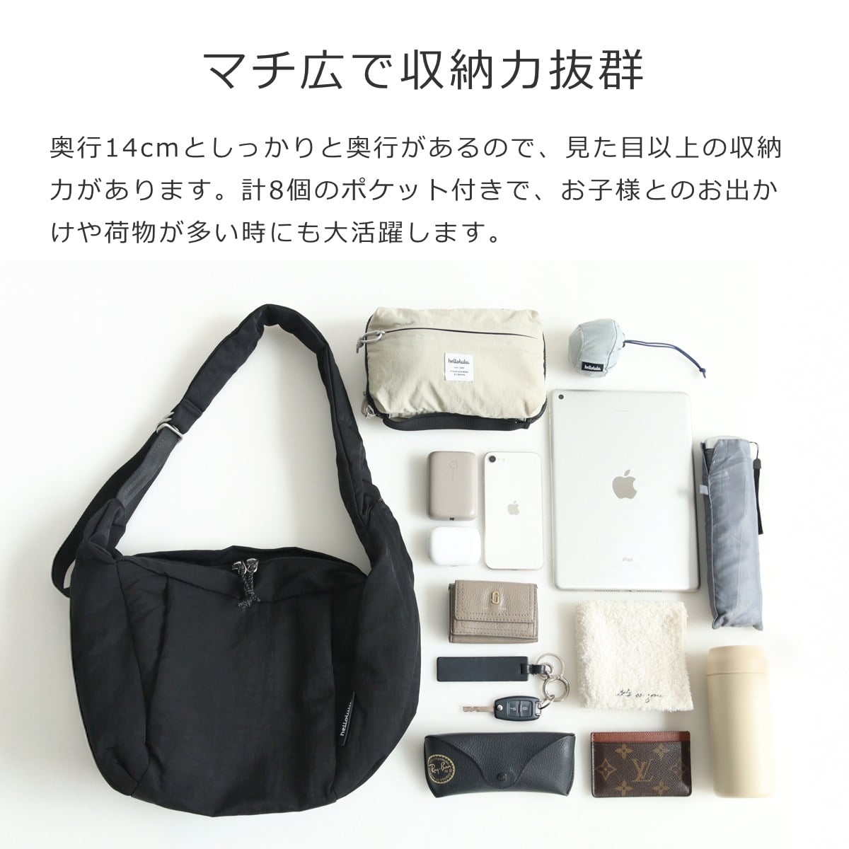 奥行14cmとしっかりと奥行があるので、いつもの荷物に水筒や折りたたみ傘、タブレットも入る見た目以上の収納力。計8個のポケット付きで、お子様とのお出かけや荷物が多い時にも大活躍します。