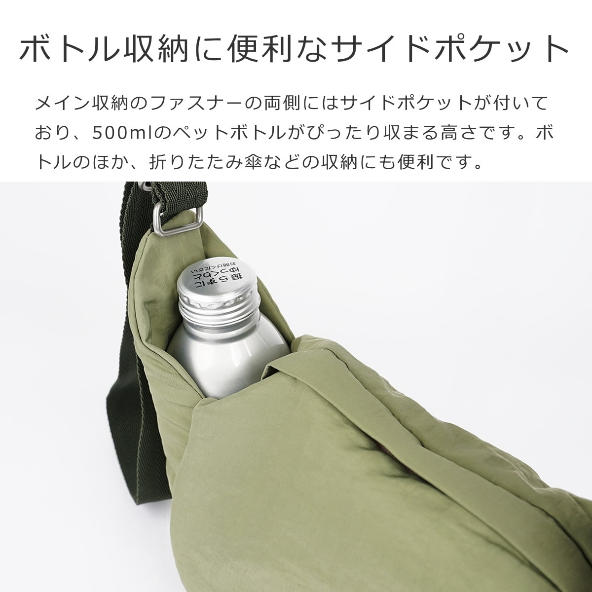 メイン収納のファスナーの両側にはサイドポケットが付いており、500mlのペットボトルがぴったり収まる高さです。ボトルのほか、折りたたみ傘などの収納にも便利です。