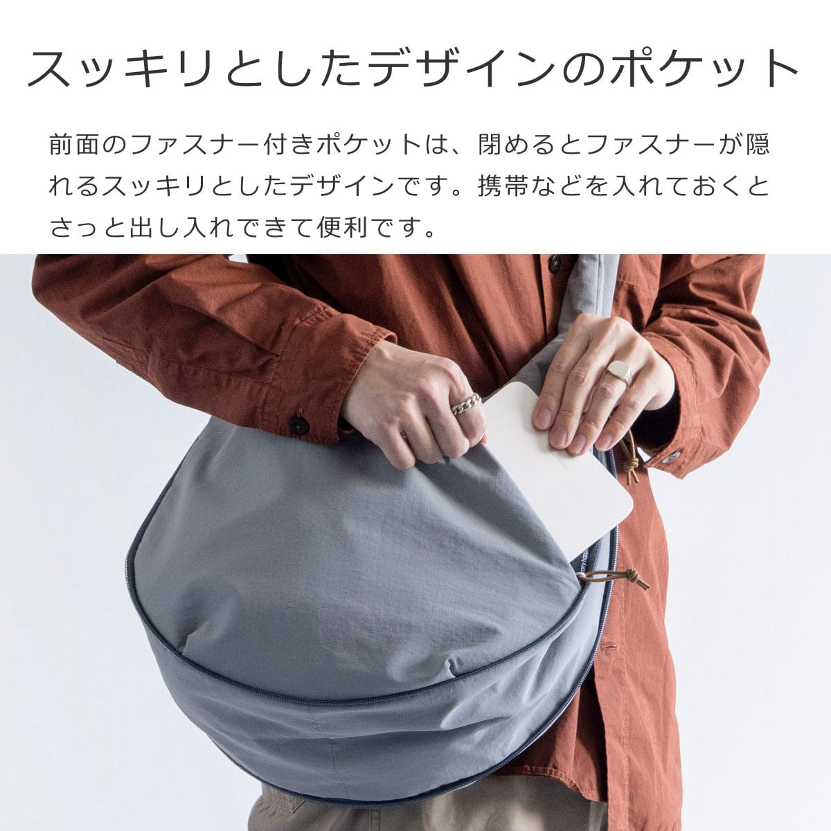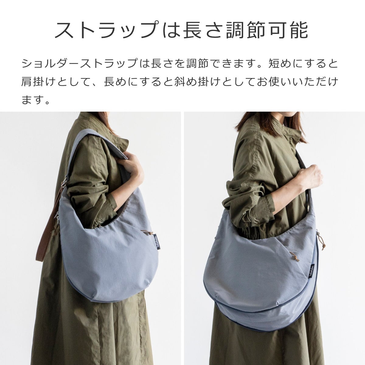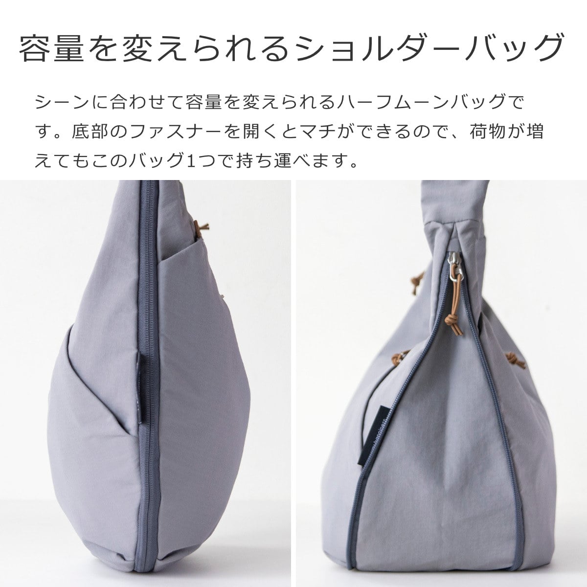 シーンに合わせて容量を変えられるハーフムーンバッグです。底部のファスナーを開くとマチができるので、荷物が増えてもこのバッグ1つで持ち運べます。