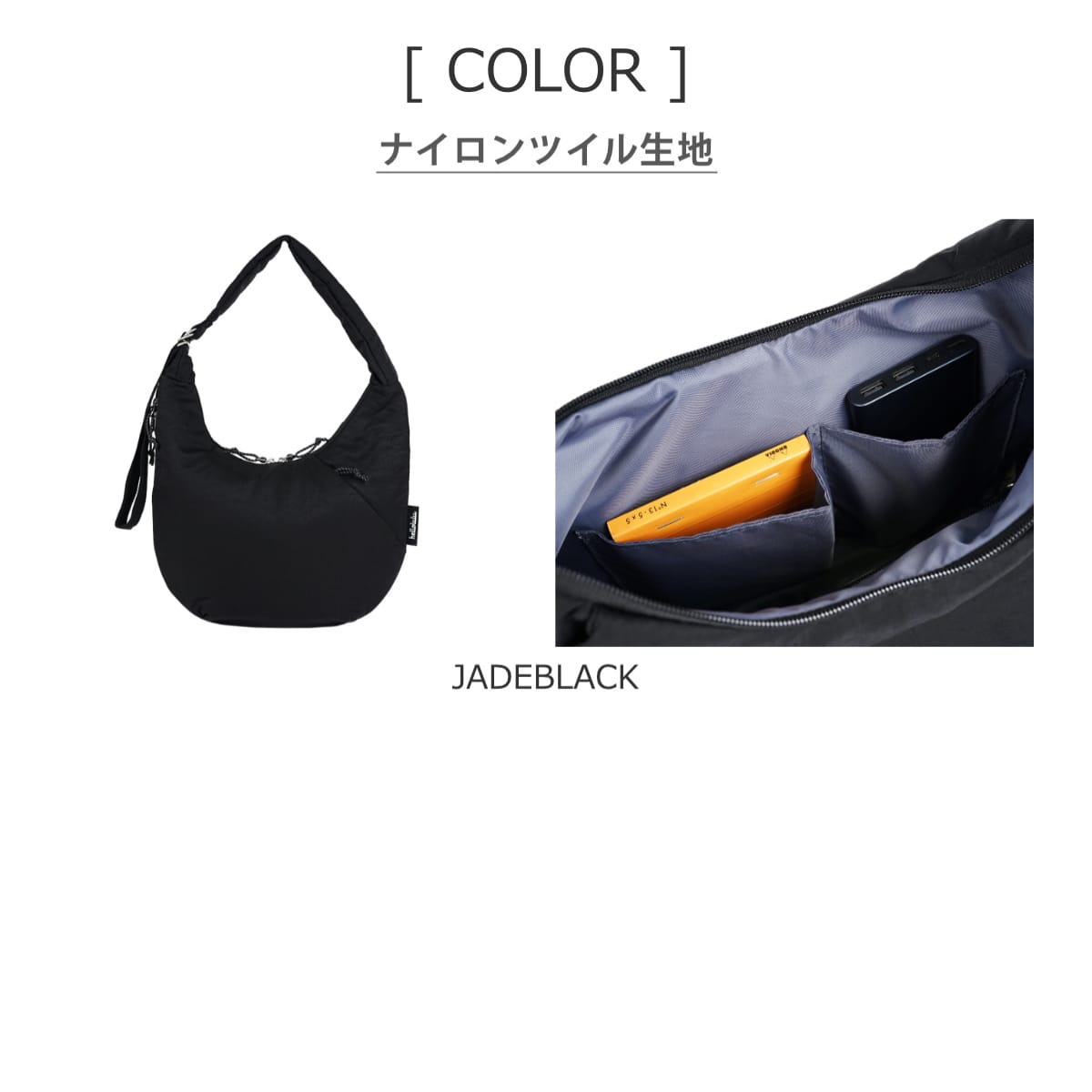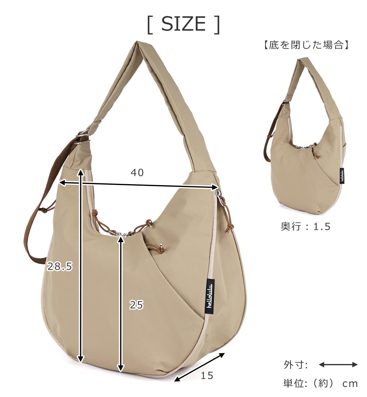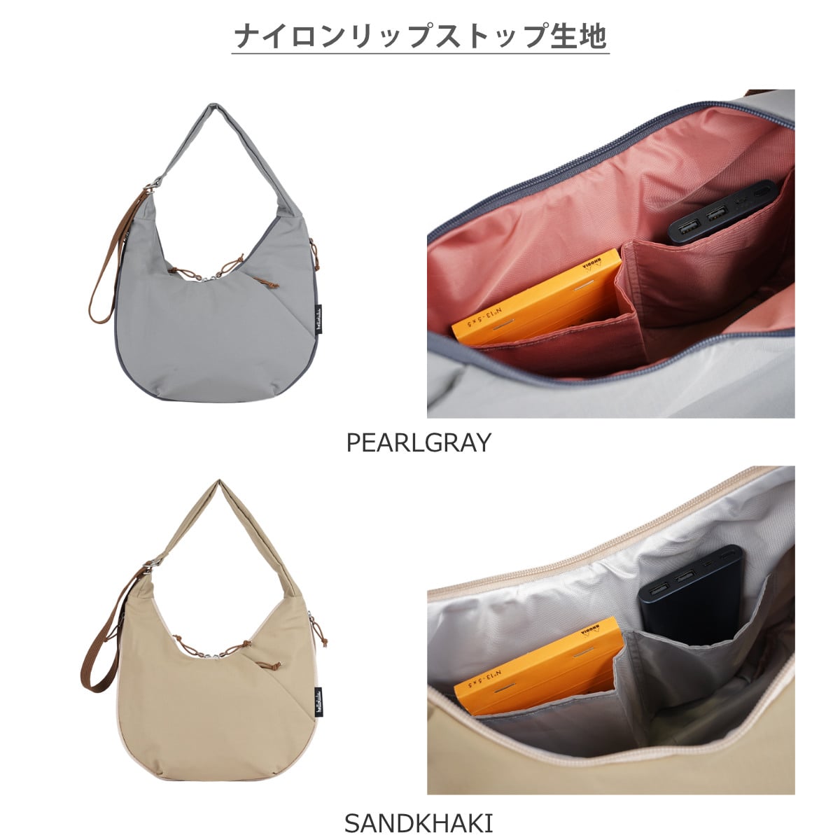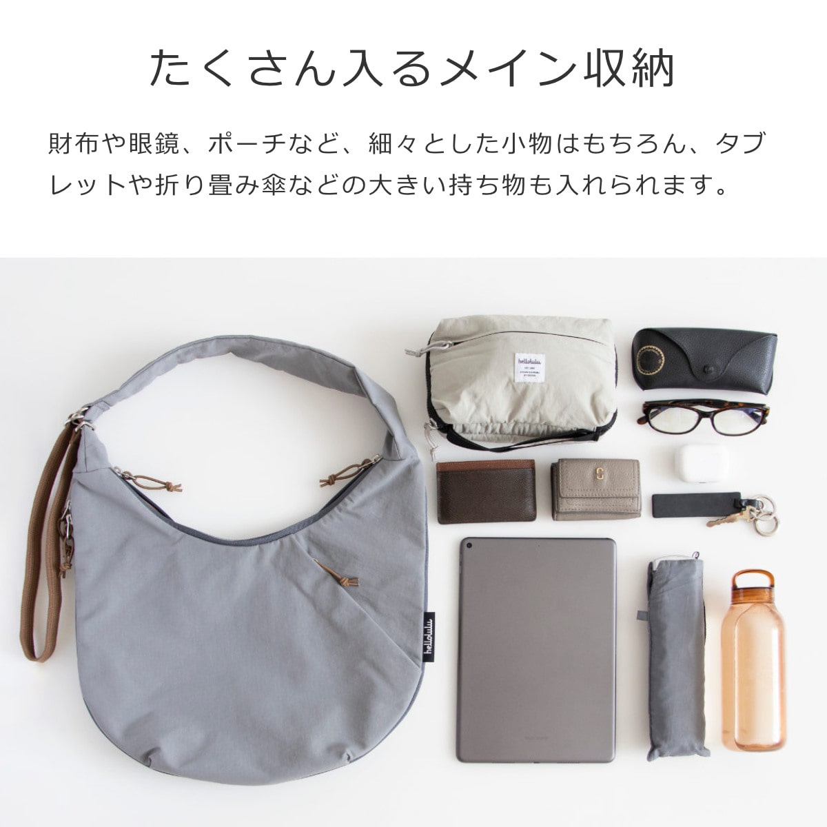 シーンに合わせて容量を変えられるハーフムーンバッグです。底部のファスナーを開くとマチができるので、荷物が増えてもこのバッグ1つで持ち運べます。
