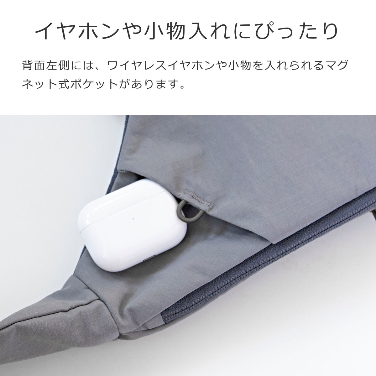 背面左側には、ワイヤレスイヤホンや小物を入れられるマグネット式ポケットがあります。