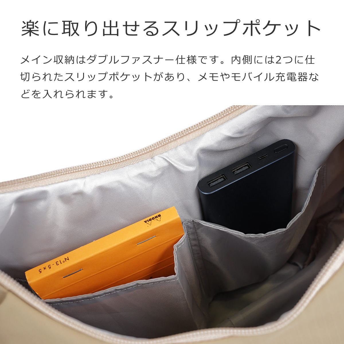 メイン収納はダブルファスナー仕様です。財布や眼鏡、ポーチなど、細々とした小物はもちろん、タブレットや折り畳み傘などの大きい持ち物も入れられます。