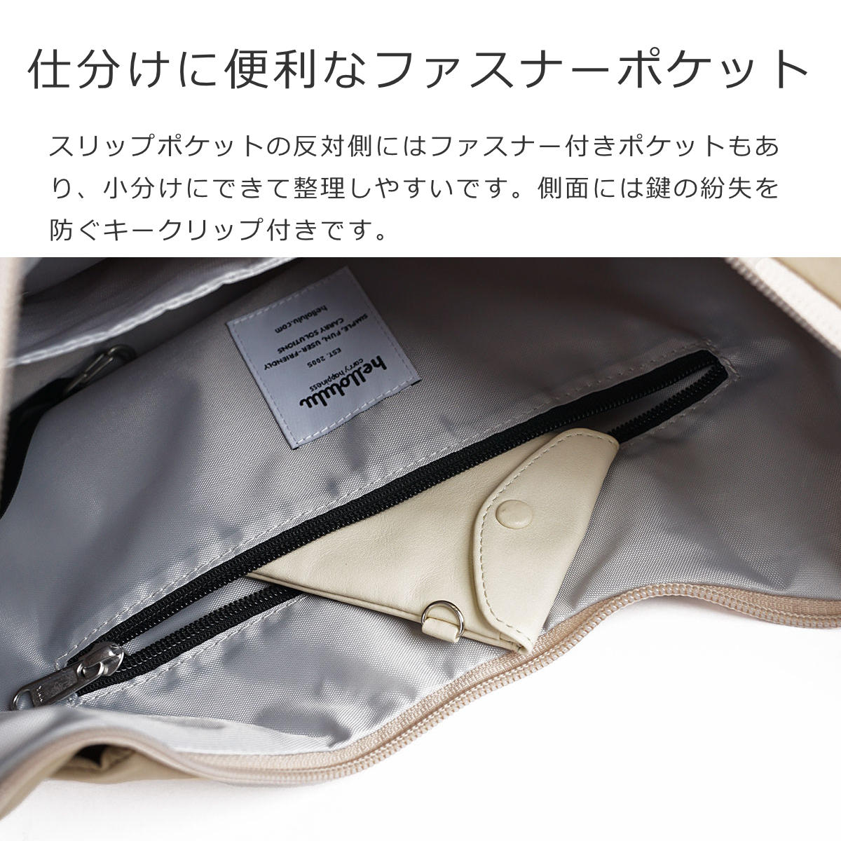 スリップポケットの反対側にはファスナー付きポケットもあり、小分けにできて整理しやすいです。側面には鍵の紛失を防ぐキークリップ付きです。