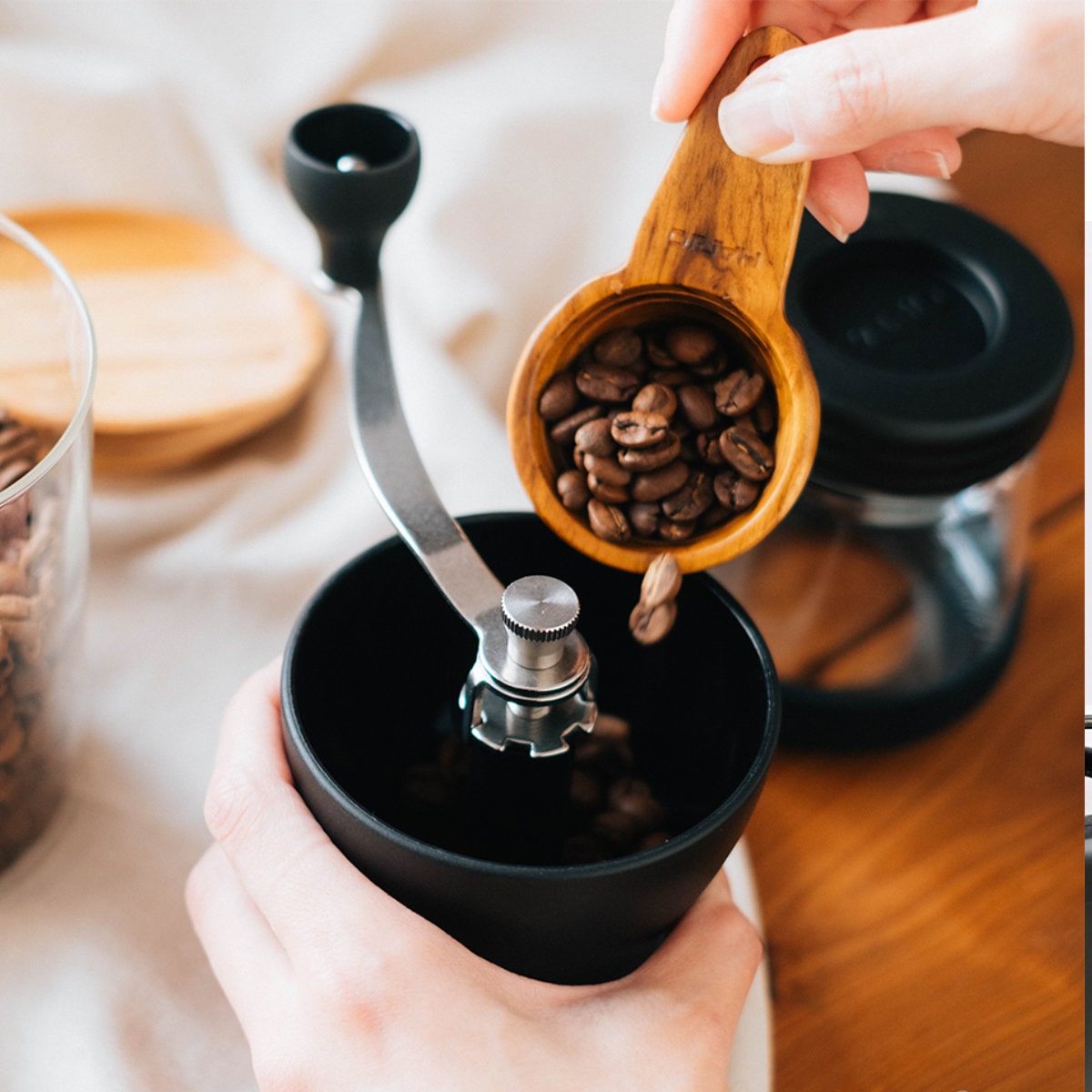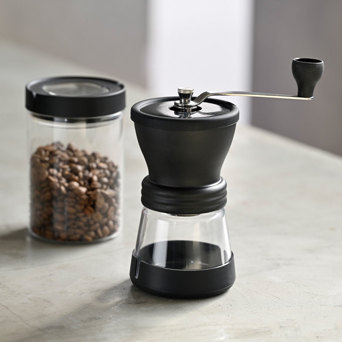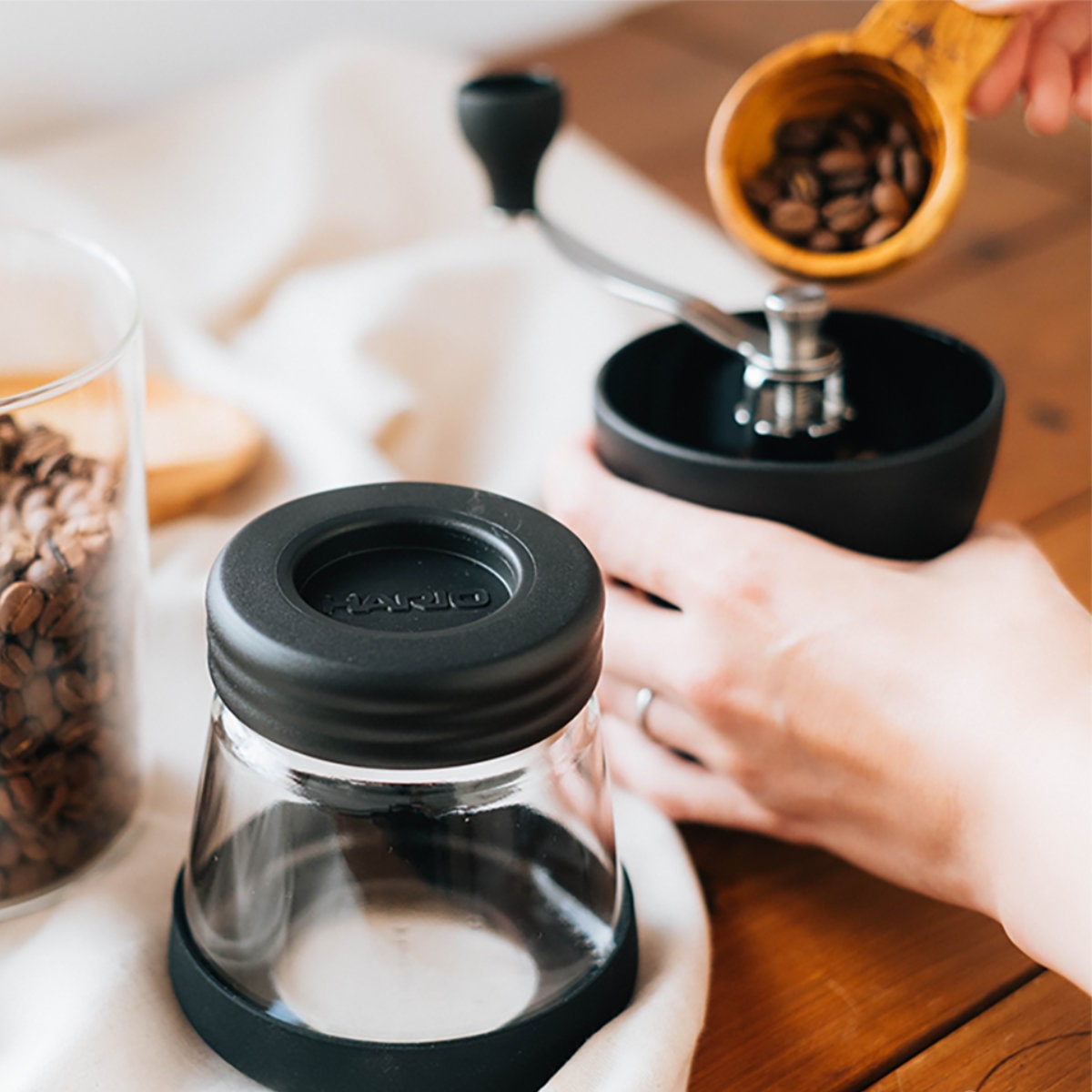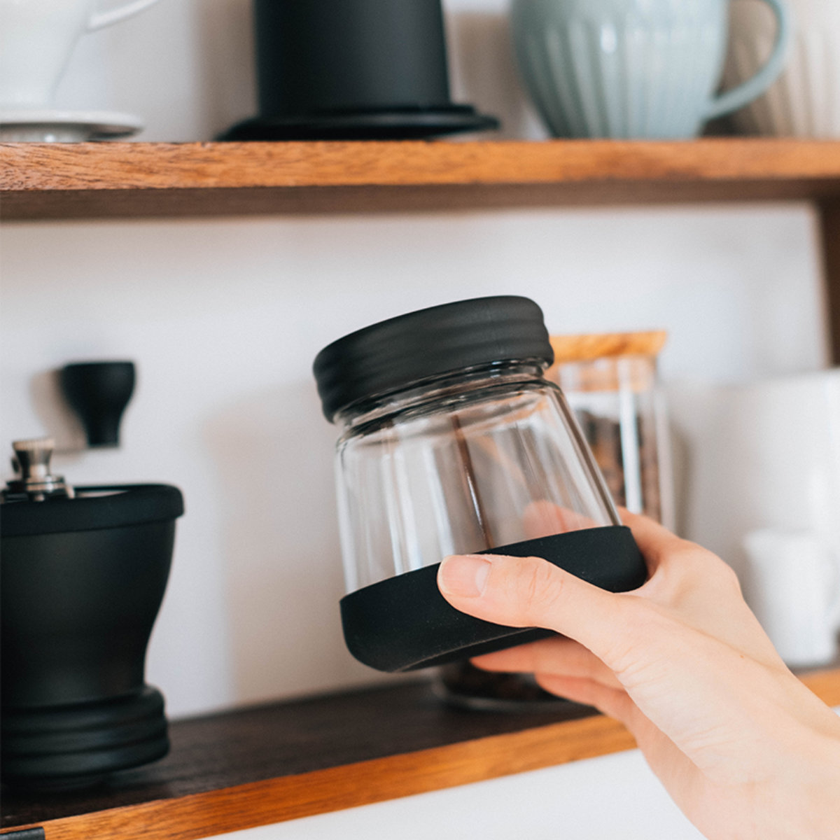 コーヒー豆を挽き終わったら下の粉受けが密封出るキャニスターになります。フタをしてコーヒー粉の保存容器に。ミル本体はフタの上に重ねられるので、省スペースで収納できます。
