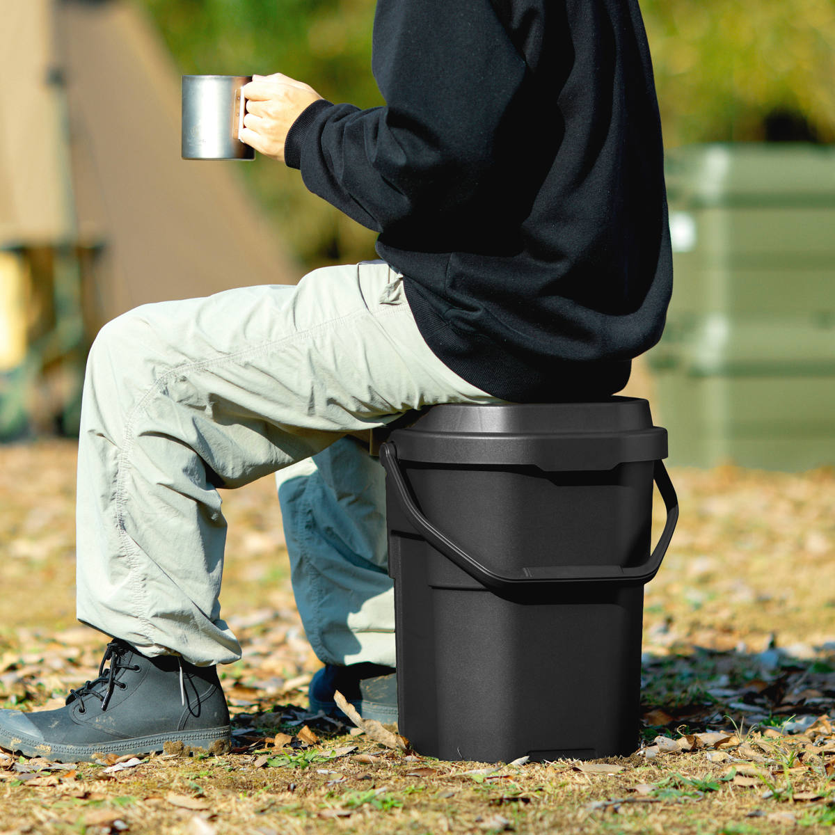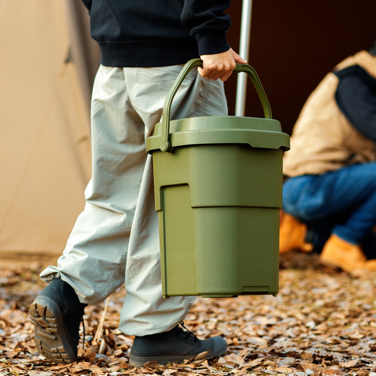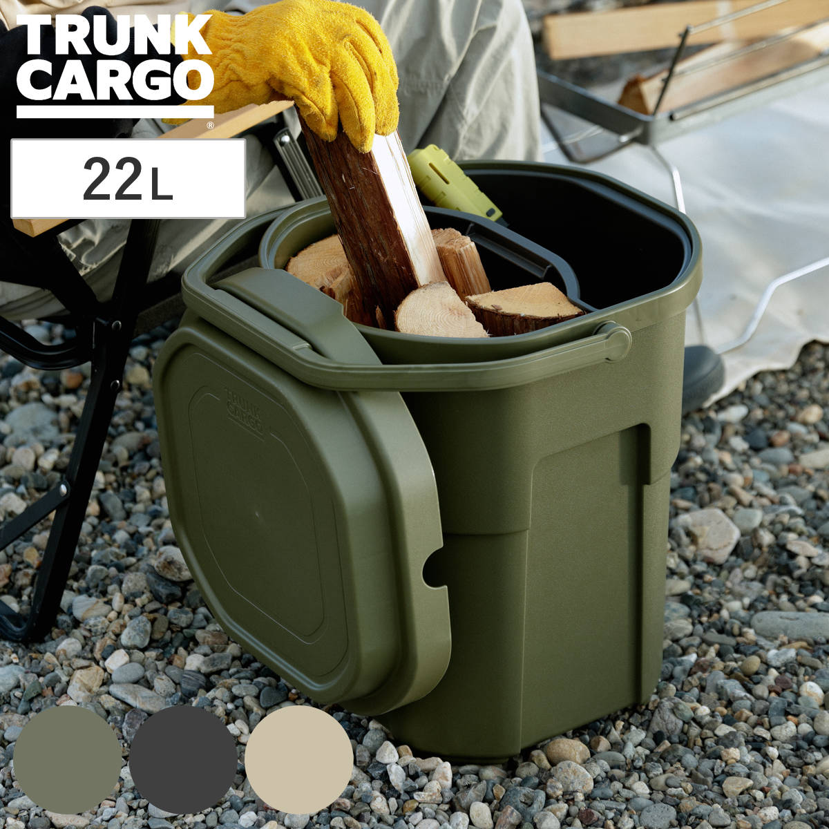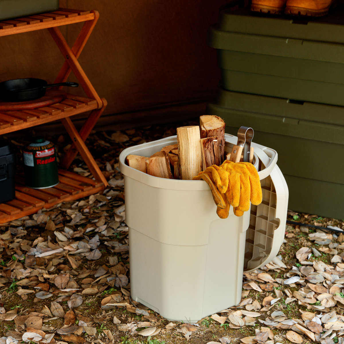 キャンプシーンでは薪入れやスツール・簡易テーブル・即席ゴミ箱として、釣り・ガーデニング・洗車の道具など、用途に合わせた様々な使い方ができます。