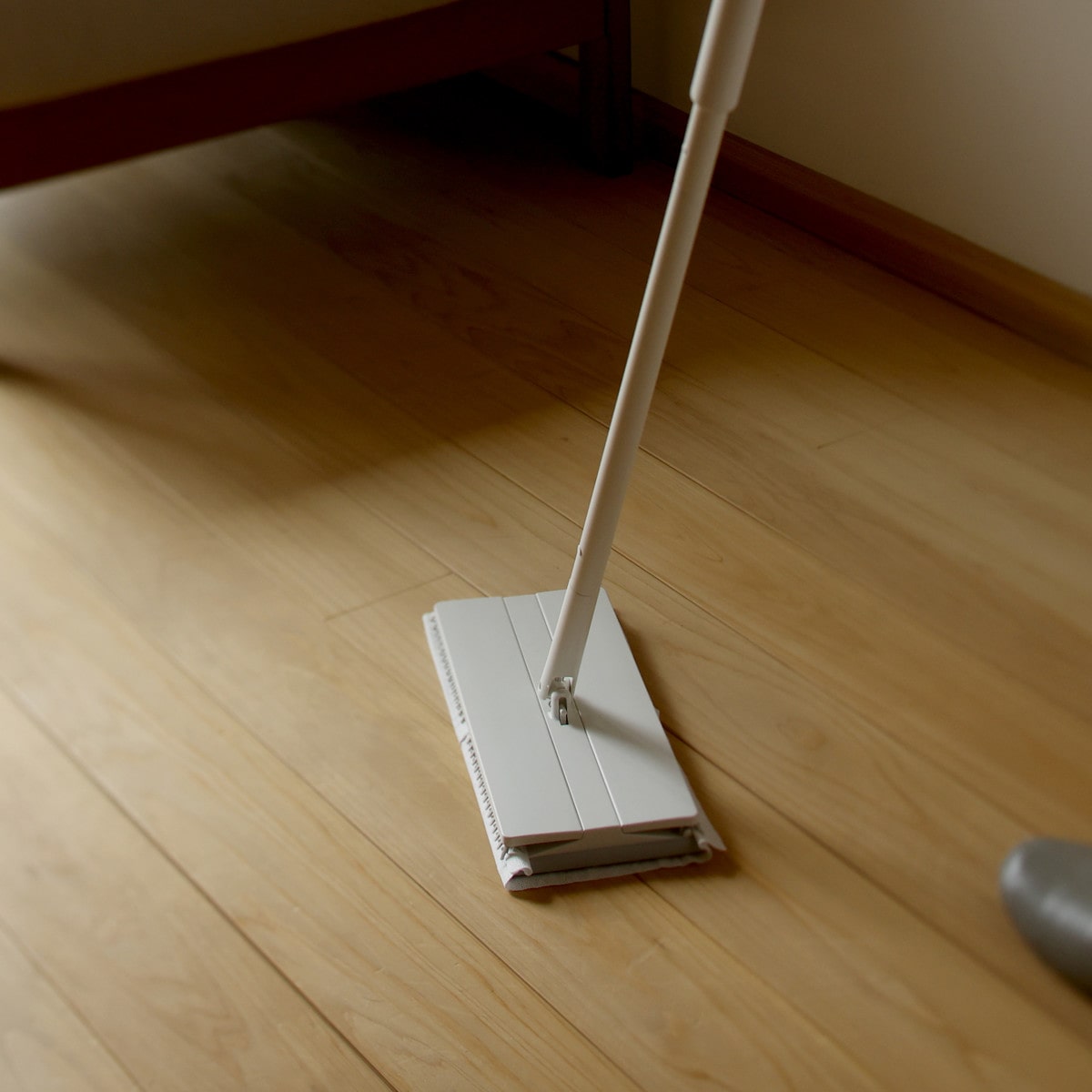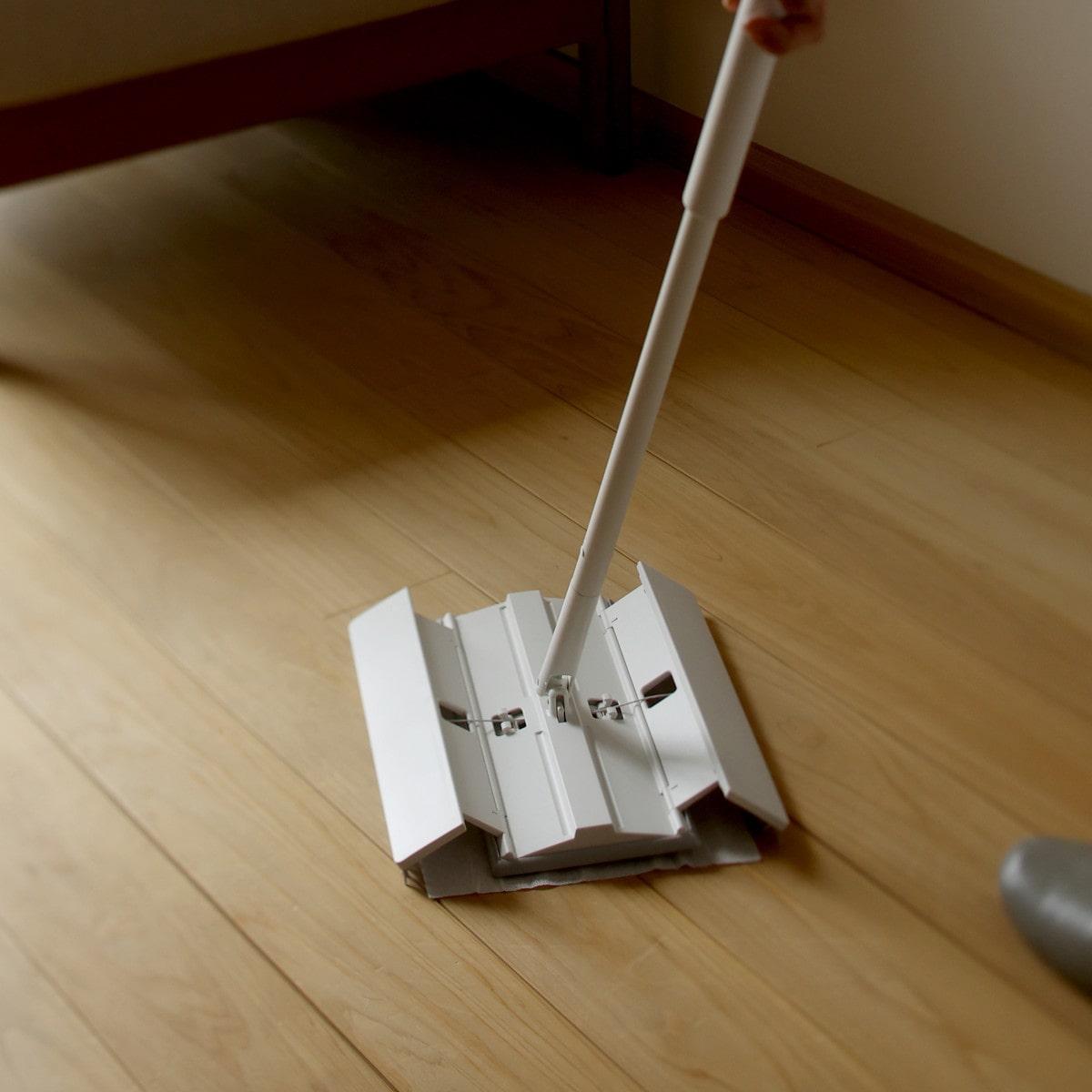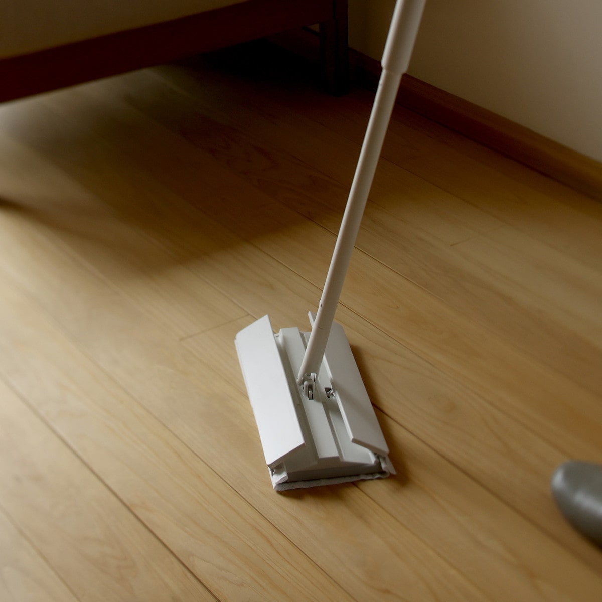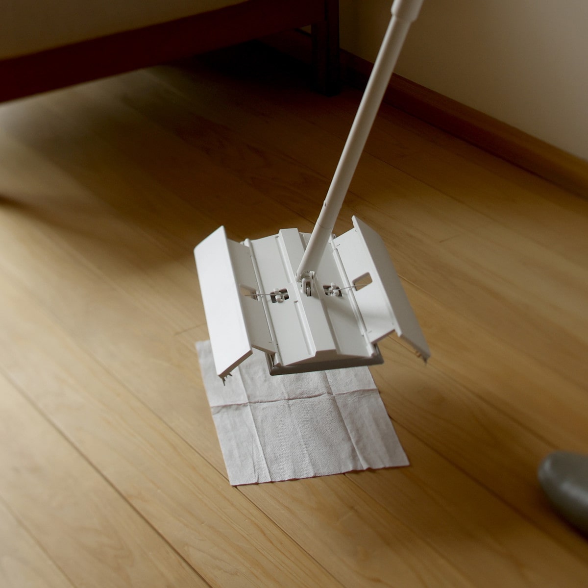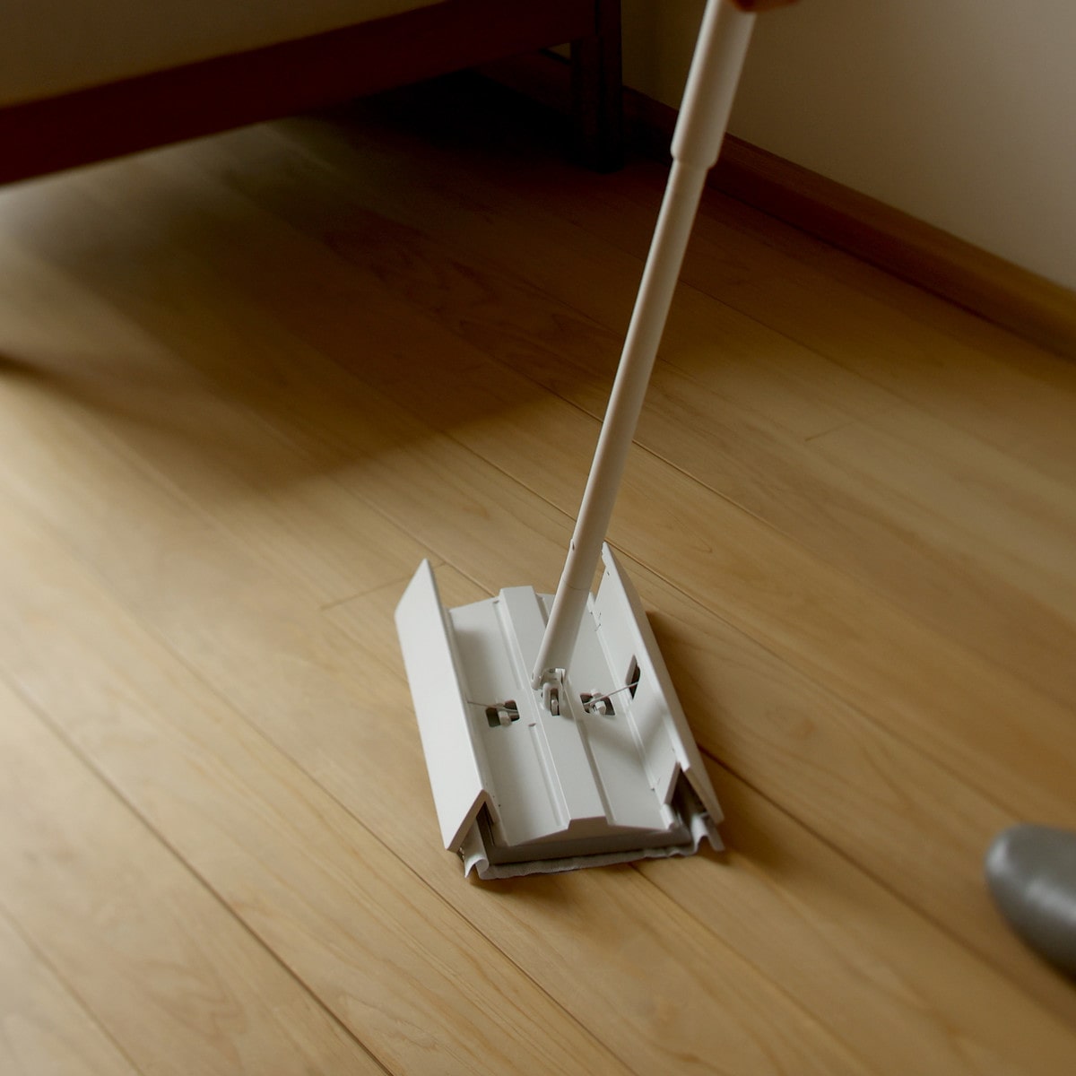 ヘッドに直接触れずにシートの付け外しができるフローリングワイパーです。ポールにあるボタンを押しながらスライダーを下げることでヘッドが開くので立ったままでも簡単に操作できます。